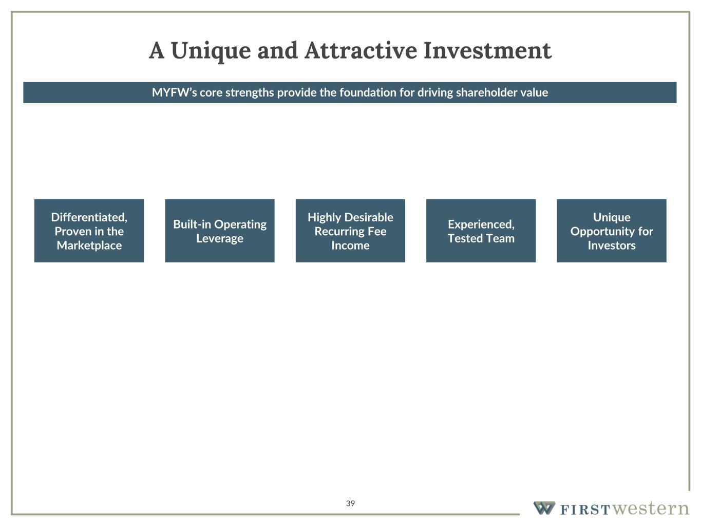 MYFW’s core strengths provide the foundation for driving shareholder value 39 A Unique and Attractive Investment Differentiated, Proven in the Marketplace Built-in Operating Leverage Highly Desirable Recurring Fee Income Experienced, Tested Team Unique Opportunity for Investors