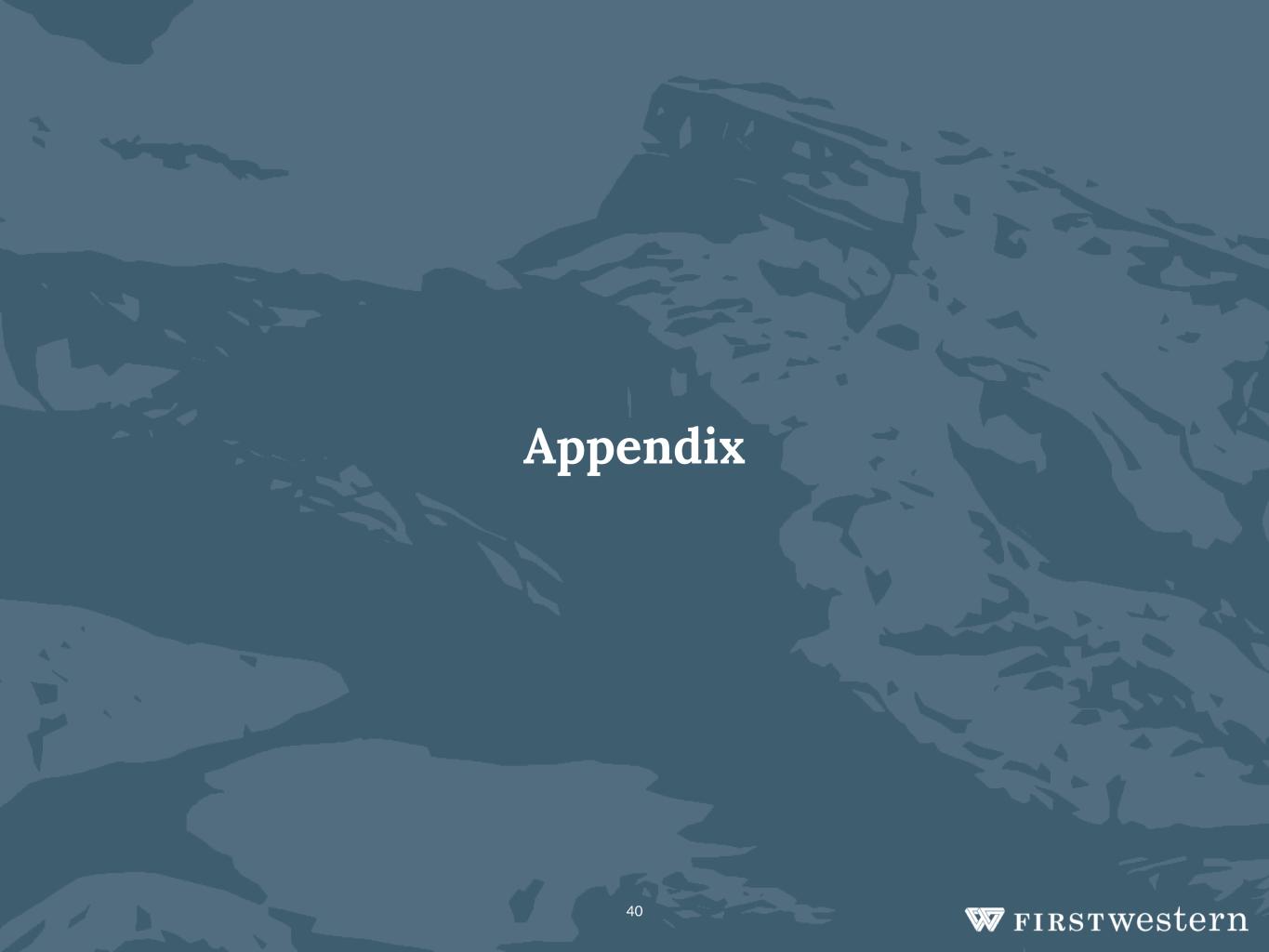 38 Long-Term Goals to Drive Shareholder Value ▪ Since our pre-2018 IPO status as of year end 2017, we have tripled total loans and total deposits, more than doubled TBV per share, had substantial increases in annual revenue, and demonstrated significant operating leverage. Looking forward we can drive shareholder value by: ▪ Continuing to execute well, creating more operating leverage to drive high performing ROAA and ROAE results ▪ Emphasizing our differentiation in marketplace ▪ Growing through $5 billion in total assets, $25 billion TIM assets through both organic growth and acquisitions, ideally: ▪ ~50 offices – infill and adjacent ▪ Maturing at $8 million in revenue per office through growing 20% ▪ 75% contribution margin per office at maturity, then growing ▪ Building footprint, scale and operating leverage with M&A ▪ Disciplined approach to be significantly earnings accretive with minimal TBV dilution ▪ Enhancing wealth management platform ▪ Upgrade omnichannel client experience ▪ Create new digital distribution channel Our mission is to be the BPBFWWMC – Best Private Bank for the Western Wealth Management Client We believe First Western can be a unique, niche focused regional powerhouse with high fee income and consistent strong earnings from our scalable wealth management platform