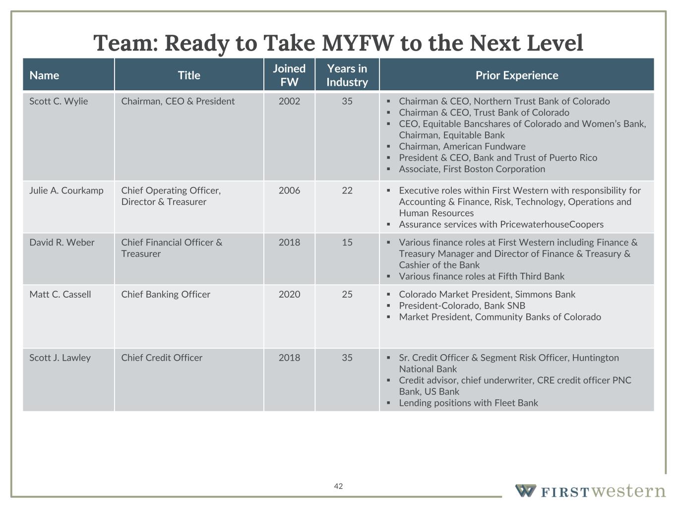 Name Title Joined FW Years in Industry Prior Experience Scott C. Wylie Chairman, CEO & President 2002 35 ▪ Chairman & CEO, Northern Trust Bank of Colorado ▪ Chairman & CEO, Trust Bank of Colorado ▪ CEO, Equitable Bancshares of Colorado and Women’s Bank, Chairman, Equitable Bank ▪ Chairman, American Fundware ▪ President & CEO, Bank and Trust of Puerto Rico ▪ Associate, First Boston Corporation Julie A. Courkamp Chief Operating Officer, Director & Treasurer 2006 22 ▪ Executive roles within First Western with responsibility for Accounting & Finance, Risk, Technology, Operations and Human Resources ▪ Assurance services with PricewaterhouseCoopers David R. Weber Chief Financial Officer & Treasurer 2018 15 ▪ Various finance roles at First Western including Finance & Treasury Manager and Director of Finance & Treasury & Cashier of the Bank ▪ Various finance roles at Fifth Third Bank Matt C. Cassell Chief Banking Officer 2020 25 ▪ Colorado Market President, Simmons Bank ▪ President-Colorado, Bank SNB ▪ Market President, Community Banks of Colorado Scott J. Lawley Chief Credit Officer 2018 35 ▪ Sr. Credit Officer & Segment Risk Officer, Huntington National Bank ▪ Credit advisor, chief underwriter, CRE credit officer PNC Bank, US Bank ▪ Lending positions with Fleet Bank 42 Team: Ready to Take MYFW to the Next Level