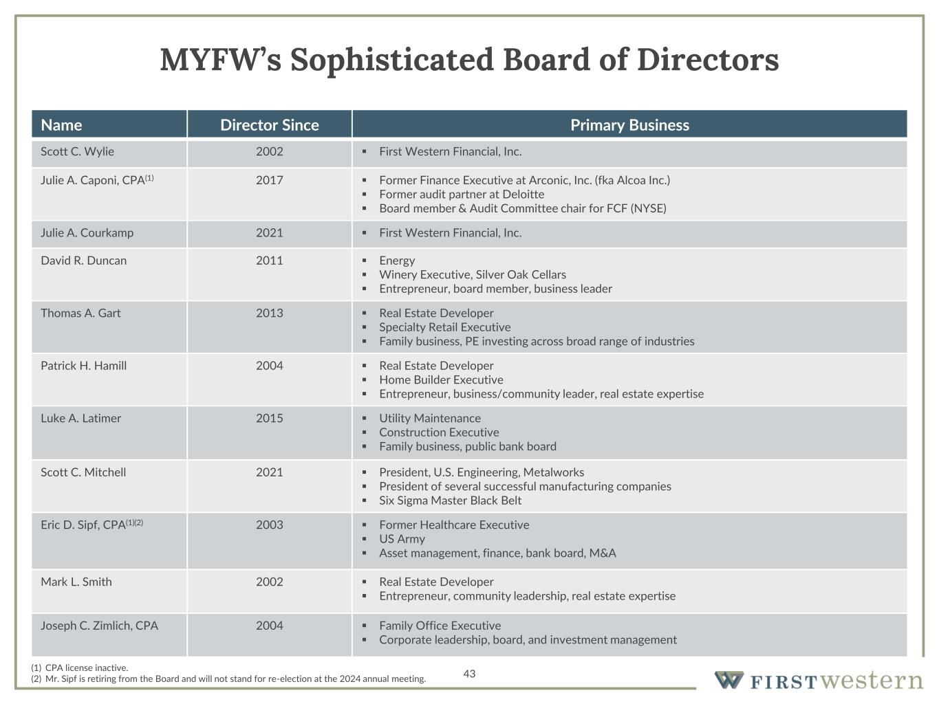 Name Director Since Primary Business Scott C. Wylie 2002 ▪ First Western Financial, Inc. Julie A. Caponi, CPA(1) 2017 ▪ Former Finance Executive at Arconic, Inc. (fka Alcoa Inc.) ▪ Former audit partner at Deloitte ▪ Board member & Audit Committee chair for FCF (NYSE) Julie A. Courkamp 2021 ▪ First Western Financial, Inc. David R. Duncan 2011 ▪ Energy ▪ Winery Executive, Silver Oak Cellars ▪ Entrepreneur, board member, business leader Thomas A. Gart 2013 ▪ Real Estate Developer ▪ Specialty Retail Executive ▪ Family business, PE investing across broad range of industries Patrick H. Hamill 2004 ▪ Real Estate Developer ▪ Home Builder Executive ▪ Entrepreneur, business/community leader, real estate expertise Luke A. Latimer 2015 ▪ Utility Maintenance ▪ Construction Executive ▪ Family business, public bank board Scott C. Mitchell 2021 ▪ President, U.S. Engineering, Metalworks ▪ President of several successful manufacturing companies ▪ Six Sigma Master Black Belt Eric D. Sipf, CPA(1)(2) 2003 ▪ Former Healthcare Executive ▪ US Army ▪ Asset management, finance, bank board, M&A Mark L. Smith 2002 ▪ Real Estate Developer ▪ Entrepreneur, community leadership, real estate expertise Joseph C. Zimlich, CPA 2004 ▪ Family Office Executive ▪ Corporate leadership, board, and investment management 43 MYFW’s Sophisticated Board of Directors (1) CPA license inactive. (2) Mr. Sipf is retiring from the Board and will not stand for re-election at the 2024 annual meeting.