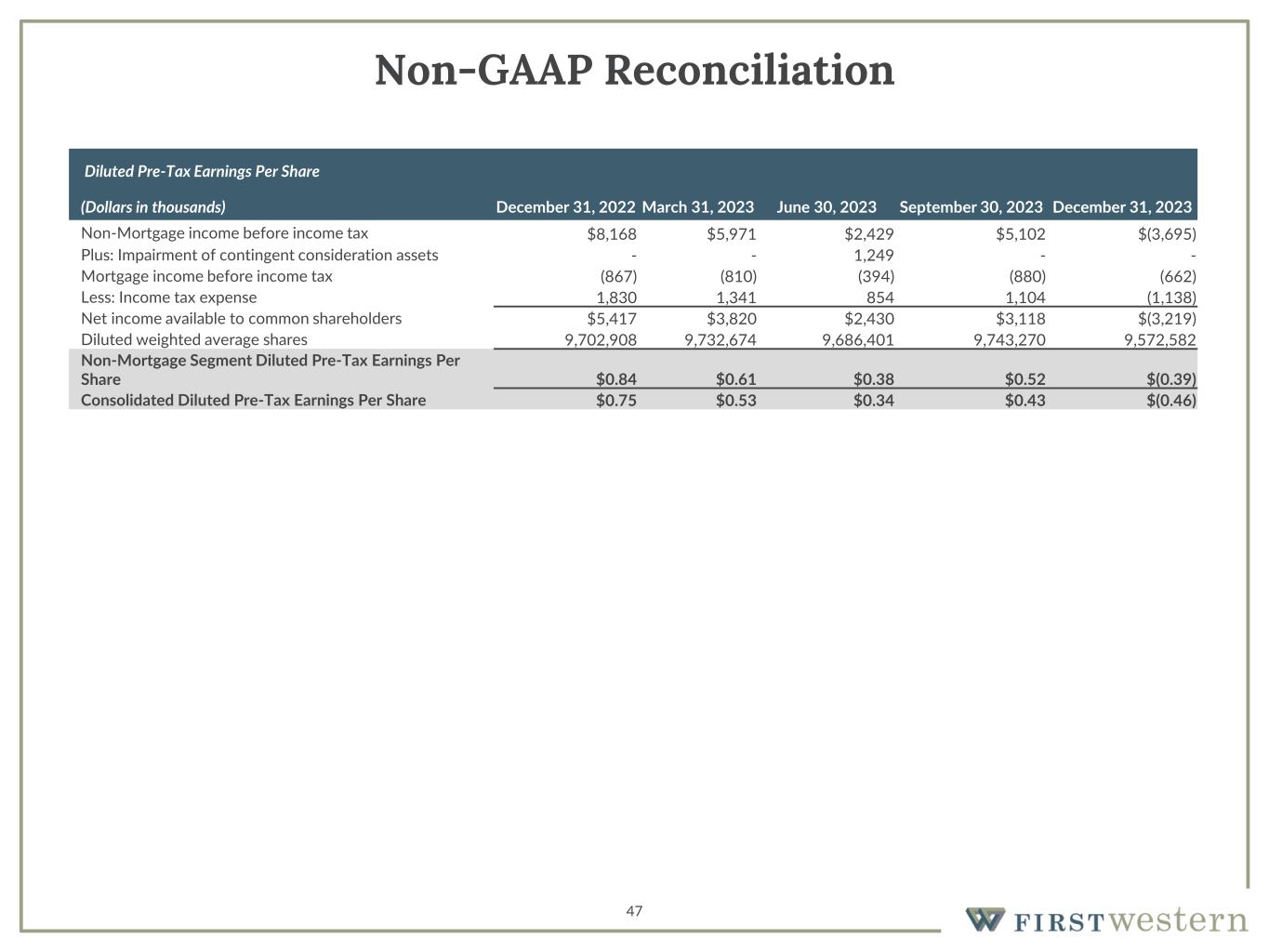 45 Non-GAAP Reconciliation Consolidated Gross Revenue For the Years Ended, (Dollars in thousands) 2016 2017 2018 2019 2020 2021 2022 2023 Total income before non-interest expense $53,394 $54,501 $57,602 $63,997 $92,615 $95,408 $107,934 $82,698 Less: Unrealized gains/(losses) recognized on equity securities - - (15) 21 15 (21) 342 (22) Less: net gain/(loss) on loans accounted for under the fair value option - - - - - - (891) (2,010) Less: Net gain on equity interests 114 81 - 119 - 489 7 - Less: Net gain on sale of assets - - - 183 - - - - Less: Net gain on loans held for sale - - - - - - (12) (178) Plus: Provision for credit losses 985 788 180 662 4,682 1,230 3,682 10,355 Gross revenue $54,265 $55,208 $57,797 $64,336 $97,282 $96,170 $112,170 $95,263 Consolidated Adjusted Pre-tax, Pre- provision Income For the Twelve Months Ended December 31, (Dollars in thousands) 2016 2017 2018 2019 2020 2021 2022 2023 Net Income before income tax, as reported $3,571 $5,007 $7,422 $10,192 $33,063 $27,280 $28,828 $7,061 Plus: Provision for credit losses 985 788 180 662 4,682 1,230 3,682 10,355 Pre-tax, Pre-provision Income $4,556 $5,795 $7,602 $10,854 $37,745 $28,510 $32,510 $17,416 Diluted Pre-Tax Earnings Per Share For the Twelve Months ended December 31, (Dollars in thousands) 2018 2019 2020 2021 2022 2023 Non-Mortgage income before income tax $8,664 $6,152 $12,086 $21,378 $31,139 $9,591 Plus: Impairment of contingent consideration assets - - - - - 1,249 Mortgage income before income tax (1,242) 4,040 20,978 5,902 (2,311) (2,530) Less: Income tax expense including acquisition tax effect 1,775 2,183 8,529 6,670 7,130 1,836 Net income available to common shareholders $5,647 $8,009 $24,535 $20,610 $21,698 $6,474 Diluted weighted average shares 5,586,620 7,914,961 7,961,904 8,235,178 9,713,623 9,725,910 Non-Mortgage Segment Diluted Pre-Tax Earnings Per Share $1.55 $0.78 $1.52 $2.60 $3.21 $1.11 Consolidated Diluted Pre-Tax Earnings Per Share $1.33 $1.29 $4.15 $3.31 $2.97 $0.85