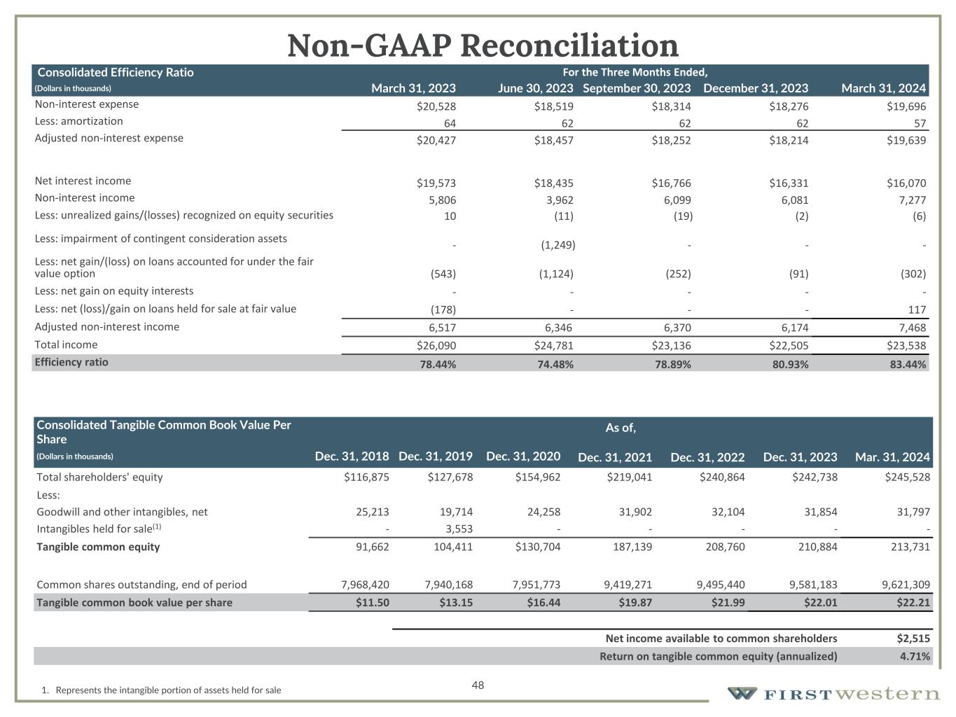 47 Non-GAAP Reconciliation Diluted Pre-Tax Earnings Per Share (Dollars in thousands) December 31, 2022 March 31, 2023 June 30, 2023 September 30, 2023 December 31, 2023 Non-Mortgage income before income tax $8,168 $5,971 $2,429 $5,102 $(3,695) Plus: Impairment of contingent consideration assets - - 1,249 - - Mortgage income before income tax (867) (810) (394) (880) (662) Less: Income tax expense 1,830 1,341 854 1,104 (1,138) Net income available to common shareholders $5,417 $3,820 $2,430 $3,118 $(3,219) Diluted weighted average shares 9,702,908 9,732,674 9,686,401 9,743,270 9,572,582 Non-Mortgage Segment Diluted Pre-Tax Earnings Per Share $0.84 $0.61 $0.38 $0.52 $(0.39) Consolidated Diluted Pre-Tax Earnings Per Share $0.75 $0.53 $0.34 $0.43 $(0.46)