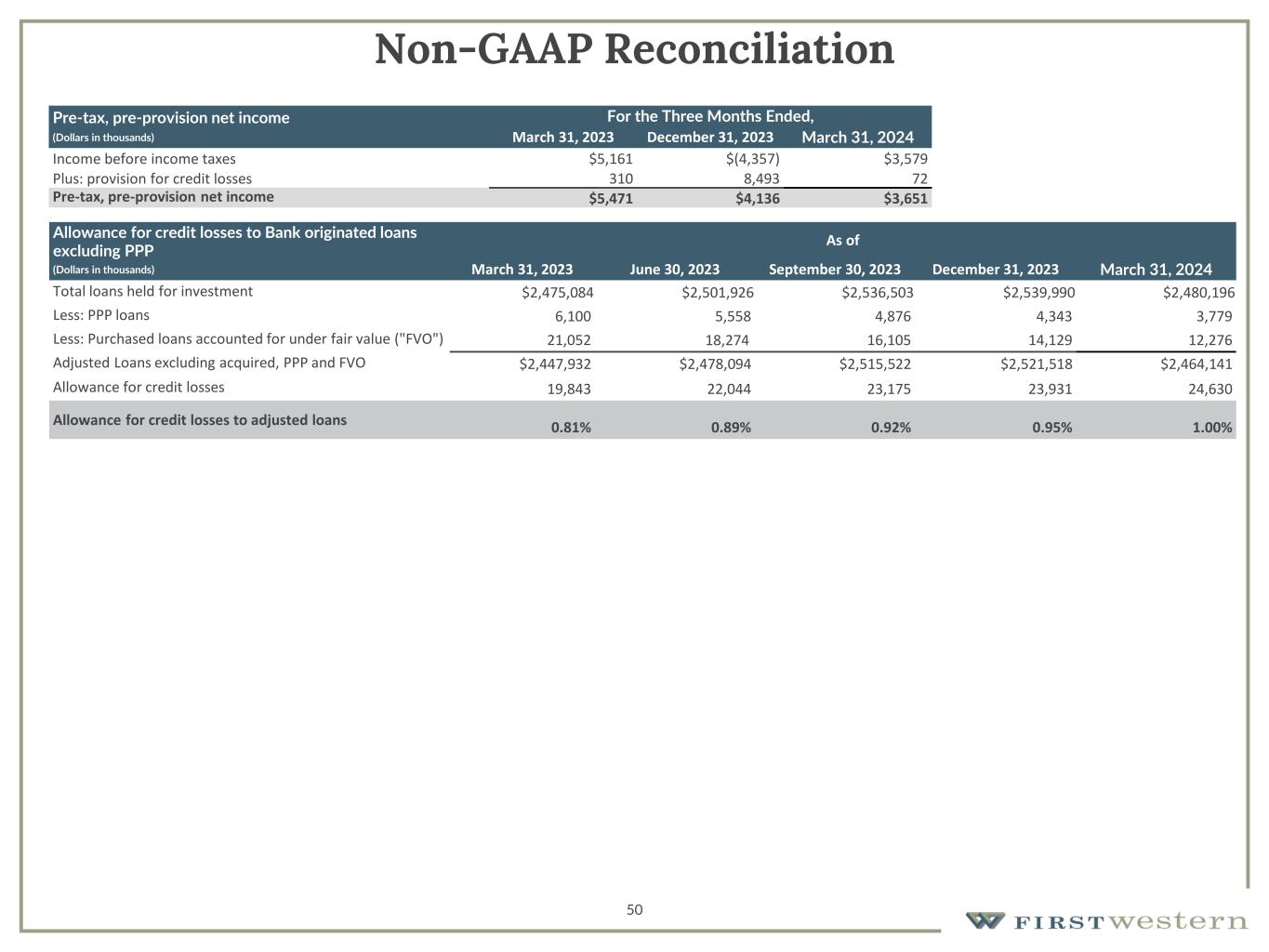 50 Non-GAAP Reconciliation Pre-tax, pre-provision net income For the Three Months Ended, (Dollars in thousands) March 31, 2023 December 31, 2023 March 31, 2024 Income before income taxes $5,161 $(4,357) $3,579 Plus: provision for credit losses 310 8,493 72 Pre-tax, pre-provision net income $5,471 $4,136 $3,651 Allowance for credit losses to Bank originated loans excluding PPP As of (Dollars in thousands) March 31, 2023 June 30, 2023 September 30, 2023 December 31, 2023 March 31, 2024 Total loans held for investment $2,475,084 $2,501,926 $2,536,503 $2,539,990 $2,480,196 Less: PPP loans 6,100 5,558 4,876 4,343 3,779 Less: Purchased loans accounted for under fair value ("FVO") 21,052 18,274 16,105 14,129 12,276 Adjusted Loans excluding acquired, PPP and FVO $2,447,932 $2,478,094 $2,515,522 $2,521,518 $2,464,141 Allowance for credit losses 19,843 22,044 23,175 23,931 24,630 Allowance for credit losses to adjusted loans 0.81% 0.89% 0.92% 0.95% 1.00%