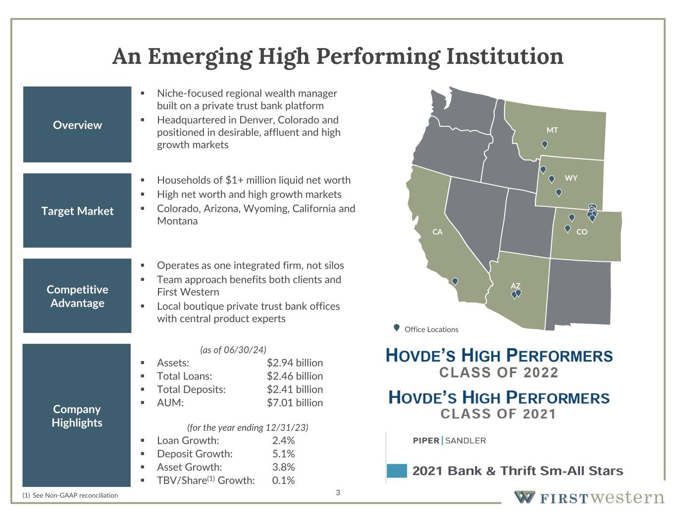 Safe Harbor 2 This presentation contains “forward-looking statements” within the meaning of Section 27A of the Securities Act of 1933, as amended, and Section 21E of the Securities Exchange Act of 1934, as amended. These forward-looking statements reflect the current views of First Western Financial, Inc.’s (“First Western”) management with respect to, among other things, future events and First Western’s financial performance. These statements are often, but not always, made through the use of words or phrases such as “may,” “should,” “could,” “predict,” “potential,” “believe,” “will likely result,” “expect,” “continue,” “will,” “anticipate,” “seek,” “estimate,” “intend,” “plan,” “position,” “project,” “future” “forecast,” “goal,” “target,” “would” and “outlook,” or the negative variations of those words or other comparable words of a future or forward-looking nature. These forward-looking statements are not historical facts, and are based on current expectations, estimates and projections about First Western’s industry, management’s beliefs and certain assumptions made by management, many of which, by their nature, are inherently uncertain and beyond First Western’s control. Accordingly, First Western cautions you that any such forward-looking statements are not guarantees of future performance and are subject to risks, assumptions and uncertainties that are difficult to predict. Although First Western believes that the expectations reflected in these forward-looking statements are reasonable as of the date made, actual results may prove to be materially different from the results expressed or implied by the forward-looking statements. The following risks and uncertainties, among others, could cause actual results and future events to differ materially from those set forth or contemplated in the forward-looking statements: integration risks in connection with acquisitions; the risk of geographic concentration in Colorado, Arizona, Wyoming, California, and Montana; the risk of changes in the economy affecting real estate values and liquidity; the risk in our ability to continue to originate residential real estate loans and sell such loans; risks specific to commercial loans and borrowers; the risk of claims and litigation pertaining to our fiduciary responsibilities; the risk of competition for investment managers and professionals; the risk of fluctuation in the value of our investment securities; the risk of changes in interest rates; and the risk of the adequacy of our allowance for credit losses and the risk in our ability to maintain a strong core deposit base or other low-cost funding sources. Additional information regarding these and other risks and uncertainties to which our business and future financial performance are subject is contained in our Annual Report on Form 10-K filed with the U.S. Securities and Exchange Commission (“SEC”) on March 15, 2023 and other documents we file with the SEC from time to time. All subsequent written and oral forward-looking statements attributable to First Western or persons acting on First Western’s behalf are expressly qualified in their entirety by this paragraph. Forward-looking statements speak only as of the date of this presentation. First Western undertakes no obligation to publicly update or otherwise revise any forward-looking statements, whether as a result of new information, future events or otherwise (except as required by law). Certain of the information contained herein may be derived from information provided by industry sources. The Company believes that such information is accurate and the sources from which it has been obtained are reliable; however, the Company cannot guaranty the accuracy of such information and has not independently verified such information. This presentation contains certain non-GAAP financial measures intended to supplement, not substitute for, comparable GAAP measures. Reconciliations of non-GAAP financial measures to GAAP financial measures are provided at the end of this presentation. Numbers in the presentation may not sum due to rounding. Our common stock is not a deposit or savings account. Our common stock is not insured by the Federal Deposit Insurance Corporation or any governmental agency or instrumentality. This presentation is not an offer to sell any securities and it is not soliciting an offer to buy any securities in any state or jurisdiction where the offer or sale is not permitted. Neither the SEC nor any state securities commission has approved or disapproved of the securities of the Company or passed upon the accuracy or adequacy of this presentation. Any representation to the contrary is a criminal offense. Except as otherwise indicated, this presentation speaks as of the date hereof. The delivery of this presentation shall not, under any circumstances, create any implication that there has been no change in the affairs of the Company after the date hereof.