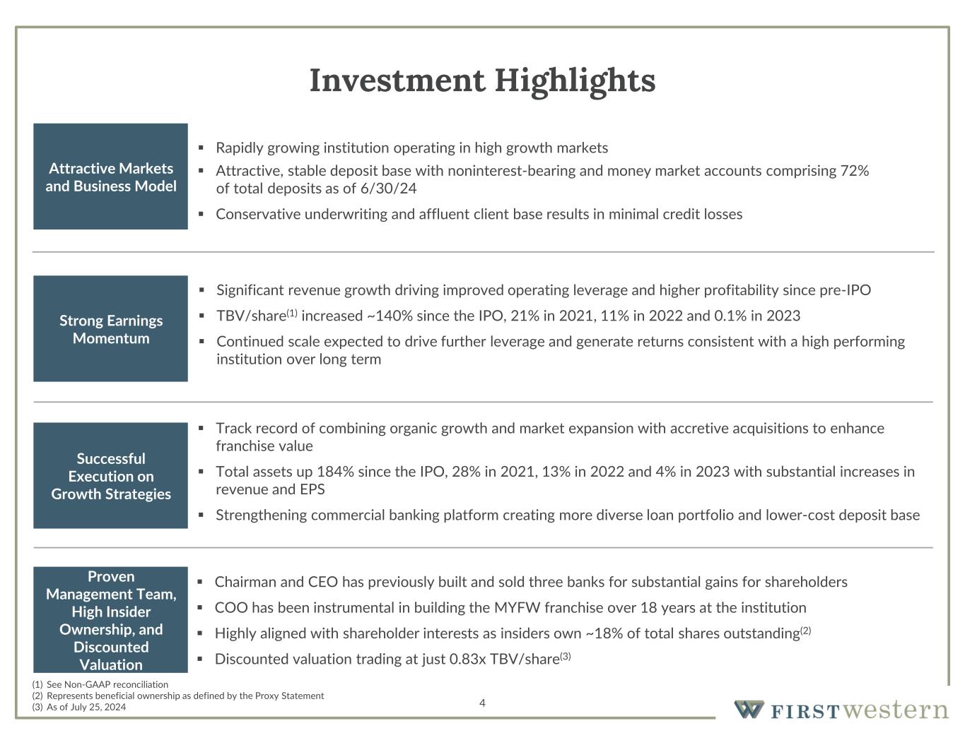 3 An Emerging High Performing Institution Overview  Niche-focused regional wealth manager built on a private trust bank platform  Headquartered in Denver, Colorado and positioned in desirable, affluent and high growth markets Target Market  Households of $1+ million liquid net worth  High net worth and high growth markets  Colorado, Arizona, Wyoming, California and Montana Company Highlights Competitive Advantage (as of 06/30/24)  Assets: $2.94 billion  Total Loans: $2.46 billion  Total Deposits: $2.41 billion  AUM: $7.01 billion (for the year ending 12/31/23)  Loan Growth: 2.4%  Deposit Growth: 5.1%  Asset Growth: 3.8%  TBV/Share(1) Growth: 0.1%  Operates as one integrated firm, not silos  Team approach benefits both clients and First Western  Local boutique private trust bank offices with central product experts (1) See Non-GAAP reconciliation CA MT AZ WY CO Office Locations