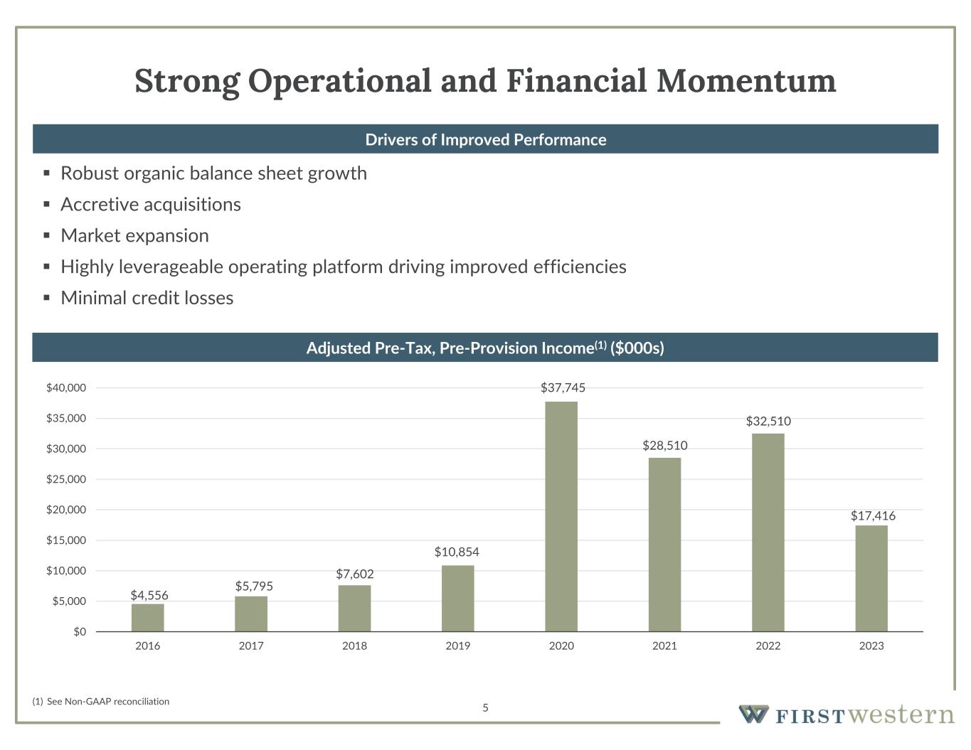 4 Investment Highlights Successful Execution on Growth Strategies Attractive Markets and Business Model Strong Earnings Momentum  Significant revenue growth driving improved operating leverage and higher profitability since pre-IPO  TBV/share(1) increased ~140% since the IPO, 21% in 2021, 11% in 2022 and 0.1% in 2023  Continued scale expected to drive further leverage and generate returns consistent with a high performing institution over long term  Chairman and CEO has previously built and sold three banks for substantial gains for shareholders  COO has been instrumental in building the MYFW franchise over 18 years at the institution  Highly aligned with shareholder interests as insiders own ~18% of total shares outstanding(2)  Discounted valuation trading at just 0.83x TBV/share(3) Proven Management Team, High Insider Ownership, and Discounted Valuation  Track record of combining organic growth and market expansion with accretive acquisitions to enhance franchise value  Total assets up 184% since the IPO, 28% in 2021, 13% in 2022 and 4% in 2023 with substantial increases in revenue and EPS  Strengthening commercial banking platform creating more diverse loan portfolio and lower-cost deposit base  Rapidly growing institution operating in high growth markets  Attractive, stable deposit base with noninterest-bearing and money market accounts comprising 72% of total deposits as of 6/30/24  Conservative underwriting and affluent client base results in minimal credit losses (1) See Non-GAAP reconciliation (2) Represents beneficial ownership as defined by the Proxy Statement (3) As of July 25, 2024
