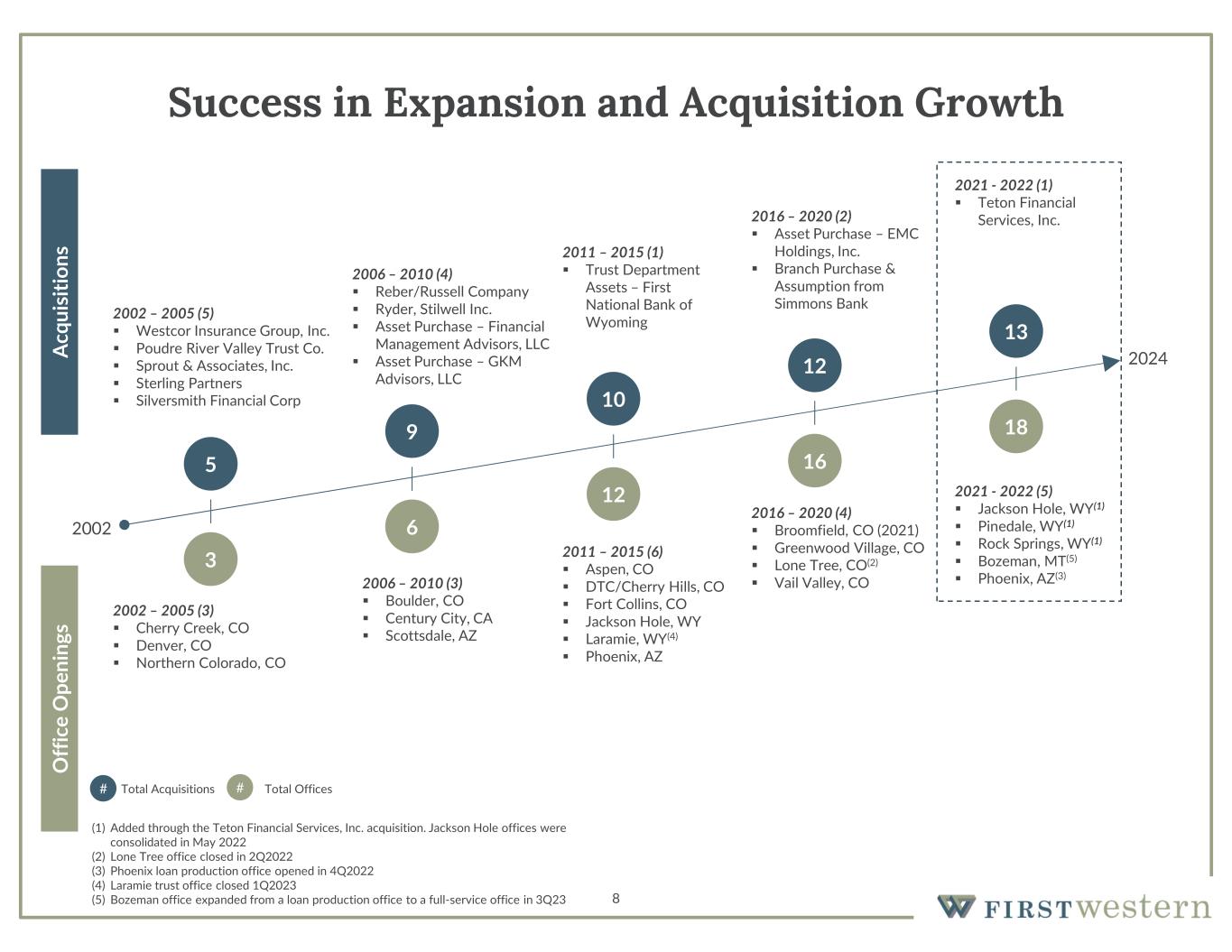 7 Great Markets, Scarce Investment Opportunity  Ranked among states with highest GDP growth  Strong job and population growth  Experiencing significant in-migration  Attractive demographics with large amount of high net worth individuals that utilize private banking and investment management services  Favorable tax laws for trusts and estates that attract wealthy individuals Denver, CO 48% Phoenix, AZ 8% Fort Collins, CO 20% Boulder, CO 7% Other 8% Rock Springs, WY 3% Jackson, WY 6% Deposits by State 79%Colorado 13%Wyoming 8%Arizona Projected % Change in HHI (2021-2026) (2) Market ShareStateMSA 11.001.00CODenver-Aurora-Lakewood 13.454.62COFort Collins 13.180.12AZPhoenix-Mesa-Scottsdale 11.411.39COBoulder 8.504.47WY/IDJackson 8.827.16WYRock Springs 9.01National Average (1) Source: S&P Capital IQ as of 06/30/2023 (2) Percentage growth in household income (HHI) Characteristics of First Western Markets Deposits by MSA (1) Small Market Share Provides Large Growth Opportunity Total Assets ($bn)Current OwnershipAs of March 31, 2024 27.5PrivateFirstBank 9.9Public (NYSE: NBHC)NBH Bank 7.6Private (Sub. Of Pinnacle Bancorp-NE)Bank of Colorado 6.6PrivateAlpine Bank 3.2PrivateANB Bank 2.9Public (Nasdaq: MYFW)First Western Trust Bank MYFW is 2nd Largest Publicly Held CO Chartered Bank