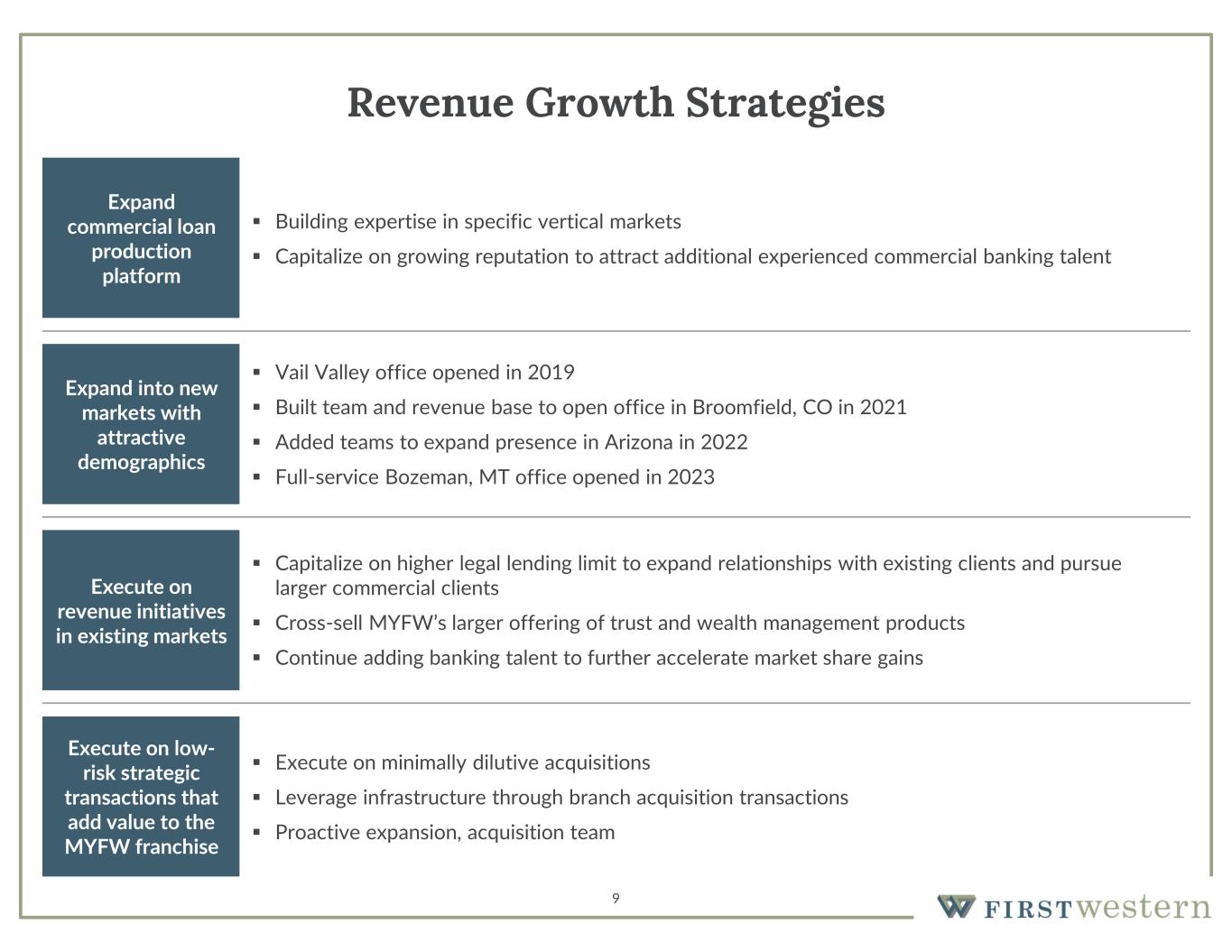 8 Success in Expansion and Acquisition Growth 2006 – 2010 (3)  Boulder, CO  Century City, CA  Scottsdale, AZ 2011 – 2015 (6)  Aspen, CO  DTC/Cherry Hills, CO  Fort Collins, CO  Jackson Hole, WY  Laramie, WY(4)  Phoenix, AZ 2016 – 2020 (4)  Broomfield, CO (2021)  Greenwood Village, CO  Lone Tree, CO(2)  Vail Valley, CO 2002 – 2005 (3)  Cherry Creek, CO  Denver, CO  Northern Colorado, CO 2002 – 2005 (5)  Westcor Insurance Group, Inc.  Poudre River Valley Trust Co.  Sprout & Associates, Inc.  Sterling Partners  Silversmith Financial Corp 2006 – 2010 (4)  Reber/Russell Company  Ryder, Stilwell Inc.  Asset Purchase – Financial Management Advisors, LLC  Asset Purchase – GKM Advisors, LLC 2011 – 2015 (1)  Trust Department Assets – First National Bank of Wyoming 2016 – 2020 (2)  Asset Purchase – EMC Holdings, Inc.  Branch Purchase & Assumption from Simmons Bank O ff ic e O pe ni ng s A cq ui si tio ns 2002 2024 3 5 6 9 12 10 16 12 # #Total Acquisitions Total Offices 18 13 2021 - 2022 (1)  Teton Financial Services, Inc. 2021 - 2022 (5)  Jackson Hole, WY(1)  Pinedale, WY(1)  Rock Springs, WY(1)  Bozeman, MT(5)  Phoenix, AZ(3) (1) Added through the Teton Financial Services, Inc. acquisition. Jackson Hole offices were consolidated in May 2022 (2) Lone Tree office closed in 2Q2022 (3) Phoenix loan production office opened in 4Q2022 (4) Laramie trust office closed 1Q2023 (5) Bozeman office expanded from a loan production office to a full-service office in 3Q23