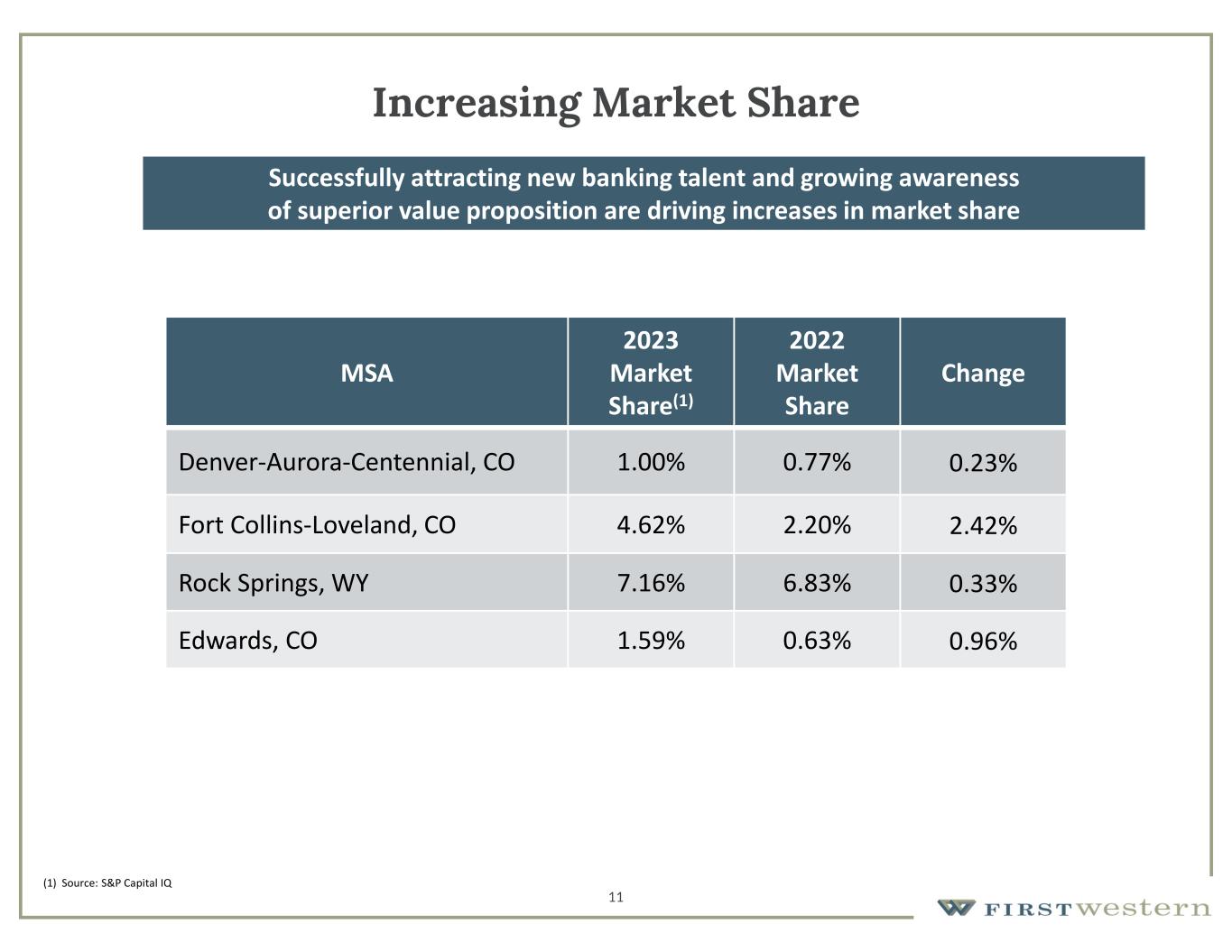 11 Increasing Market Share Successfully attracting new banking talent and growing awareness of superior value proposition are driving increases in market share Change 2022 Market Share 2023 Market Share(1) MSA 0.23%0.77%1.00%Denver-Aurora-Centennial, CO 2.42%2.20%4.62%Fort Collins-Loveland, CO 0.33%6.83%7.16%Rock Springs, WY 0.96%0.63%1.59%Edwards, CO (1) Source: S&P Capital IQ