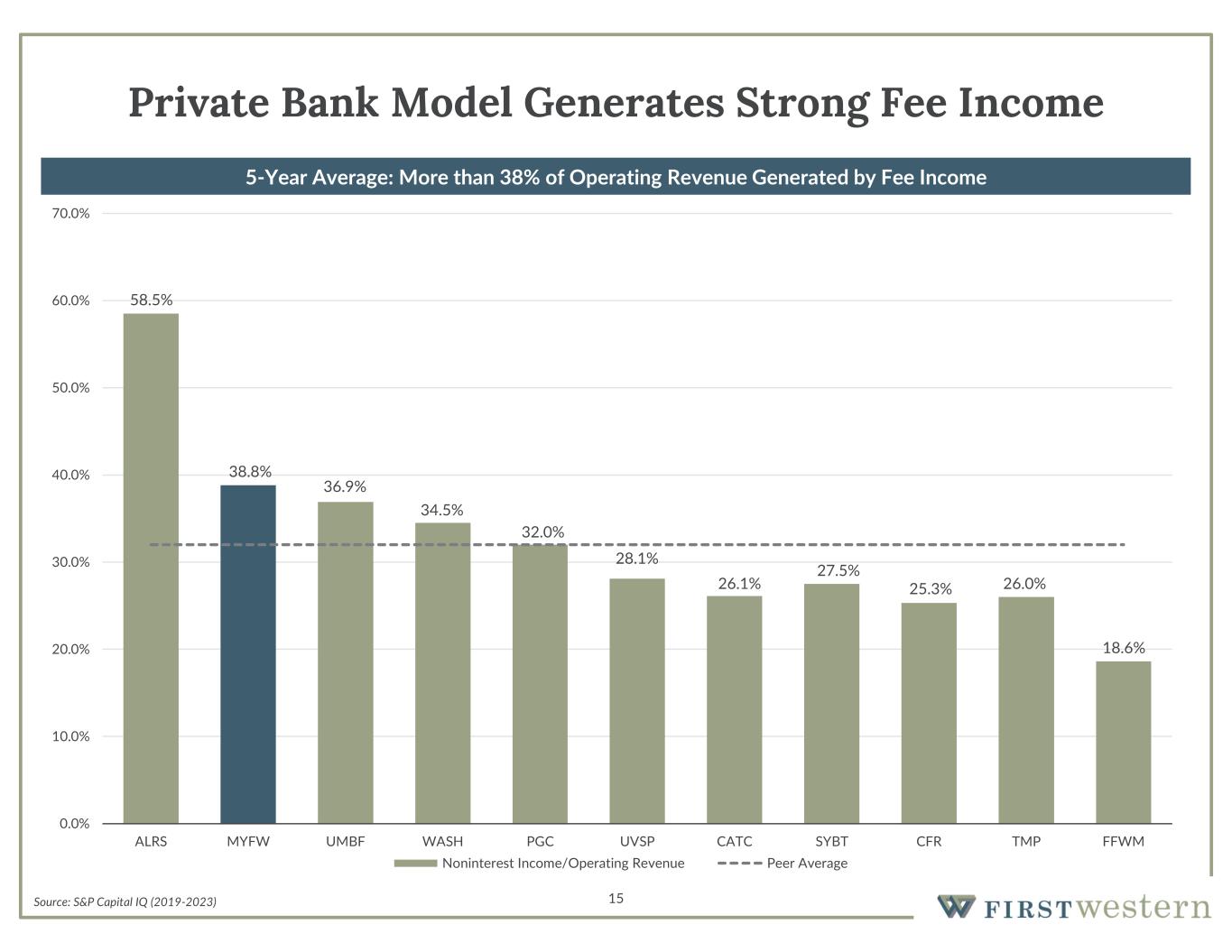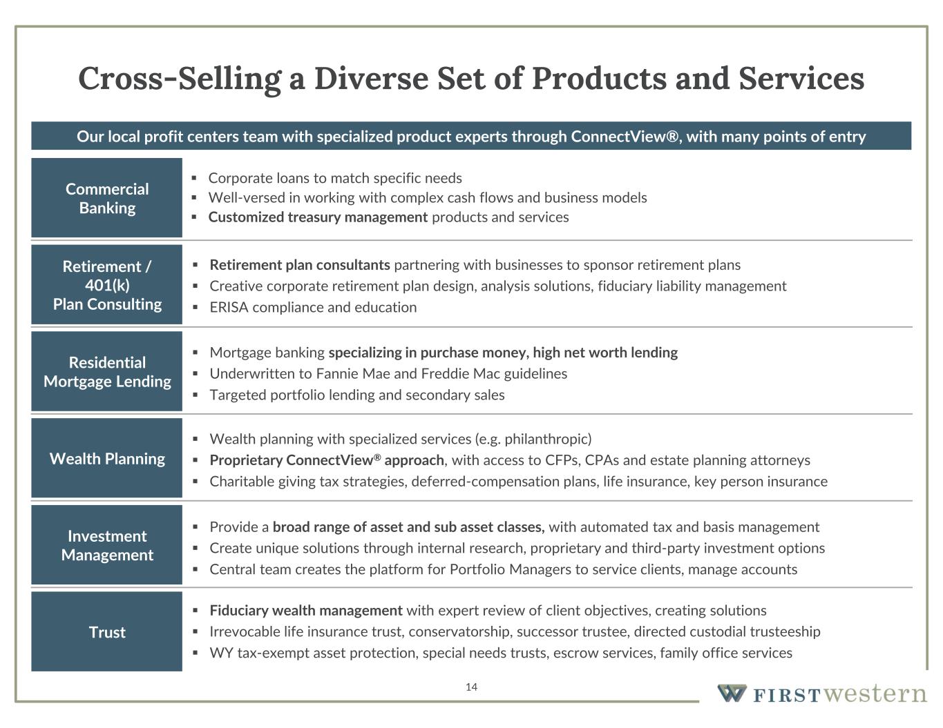  Corporate loans to match specific needs  Well-versed in working with complex cash flows and business models  Customized treasury management products and services 14 Cross-Selling a Diverse Set of Products and Services Commercial Banking  Fiduciary wealth management with expert review of client objectives, creating solutions  Irrevocable life insurance trust, conservatorship, successor trustee, directed custodial trusteeship  WY tax-exempt asset protection, special needs trusts, escrow services, family office services  Provide a broad range of asset and sub asset classes, with automated tax and basis management  Create unique solutions through internal research, proprietary and third-party investment options  Central team creates the platform for Portfolio Managers to service clients, manage accounts  Wealth planning with specialized services (e.g. philanthropic)  Proprietary ConnectView® approach, with access to CFPs, CPAs and estate planning attorneys  Charitable giving tax strategies, deferred-compensation plans, life insurance, key person insurance  Mortgage banking specializing in purchase money, high net worth lending  Underwritten to Fannie Mae and Freddie Mac guidelines  Targeted portfolio lending and secondary sales  Retirement plan consultants partnering with businesses to sponsor retirement plans  Creative corporate retirement plan design, analysis solutions, fiduciary liability management  ERISA compliance and education Retirement / 401(k) Plan Consulting Residential Mortgage Lending Wealth Planning Investment Management Trust Our local profit centers team with specialized product experts through ConnectView®, with many points of entry