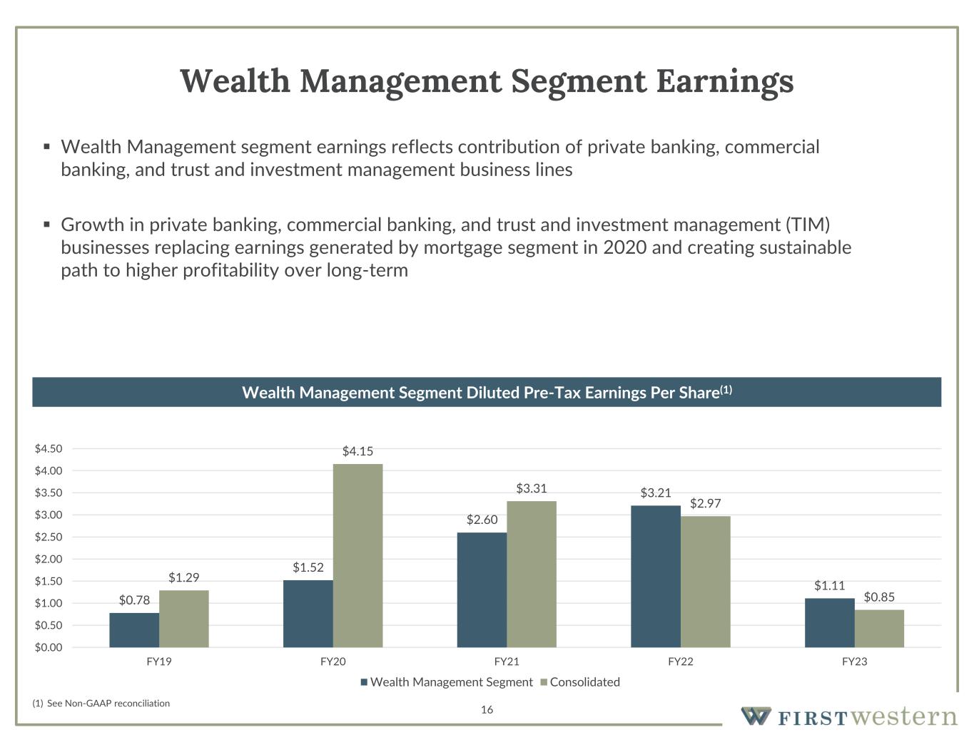 16 Wealth Management Segment Earnings (1) See Non-GAAP reconciliation $0.78 $1.52 $2.60 $3.21 $1.11$1.29 $4.15 $3.31 $2.97 $0.85 $0.00 $0.50 $1.00 $1.50 $2.00 $2.50 $3.00 $3.50 $4.00 $4.50 FY19 FY20 FY21 FY22 FY23 Wealth Management Segment Consolidated  Wealth Management segment earnings reflects contribution of private banking, commercial banking, and trust and investment management business lines  Growth in private banking, commercial banking, and trust and investment management (TIM) businesses replacing earnings generated by mortgage segment in 2020 and creating sustainable path to higher profitability over long-term Wealth Management Segment Diluted Pre-Tax Earnings Per Share(1)