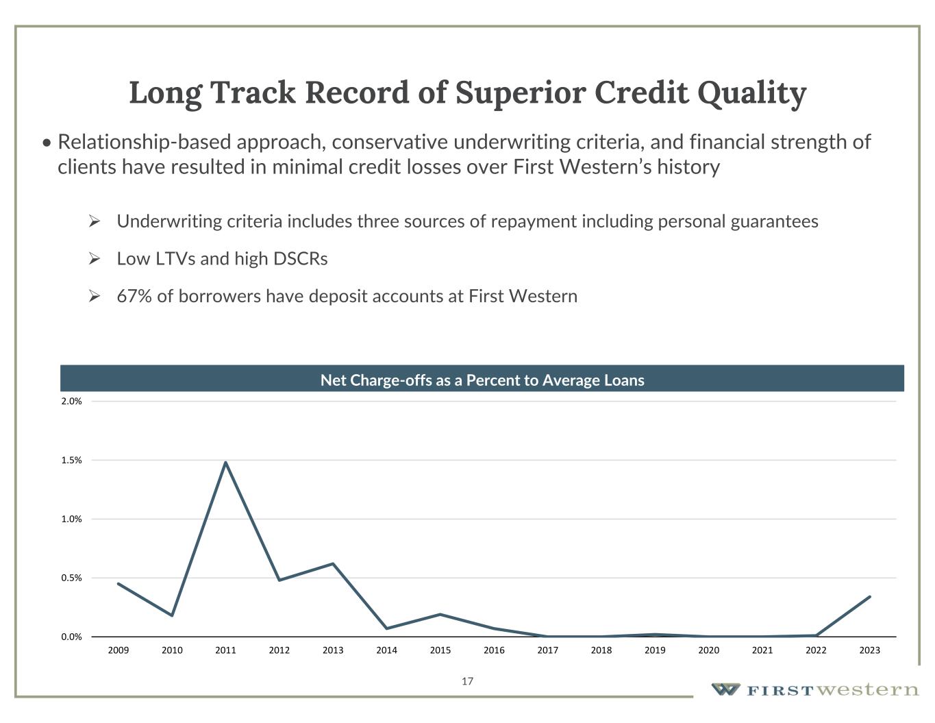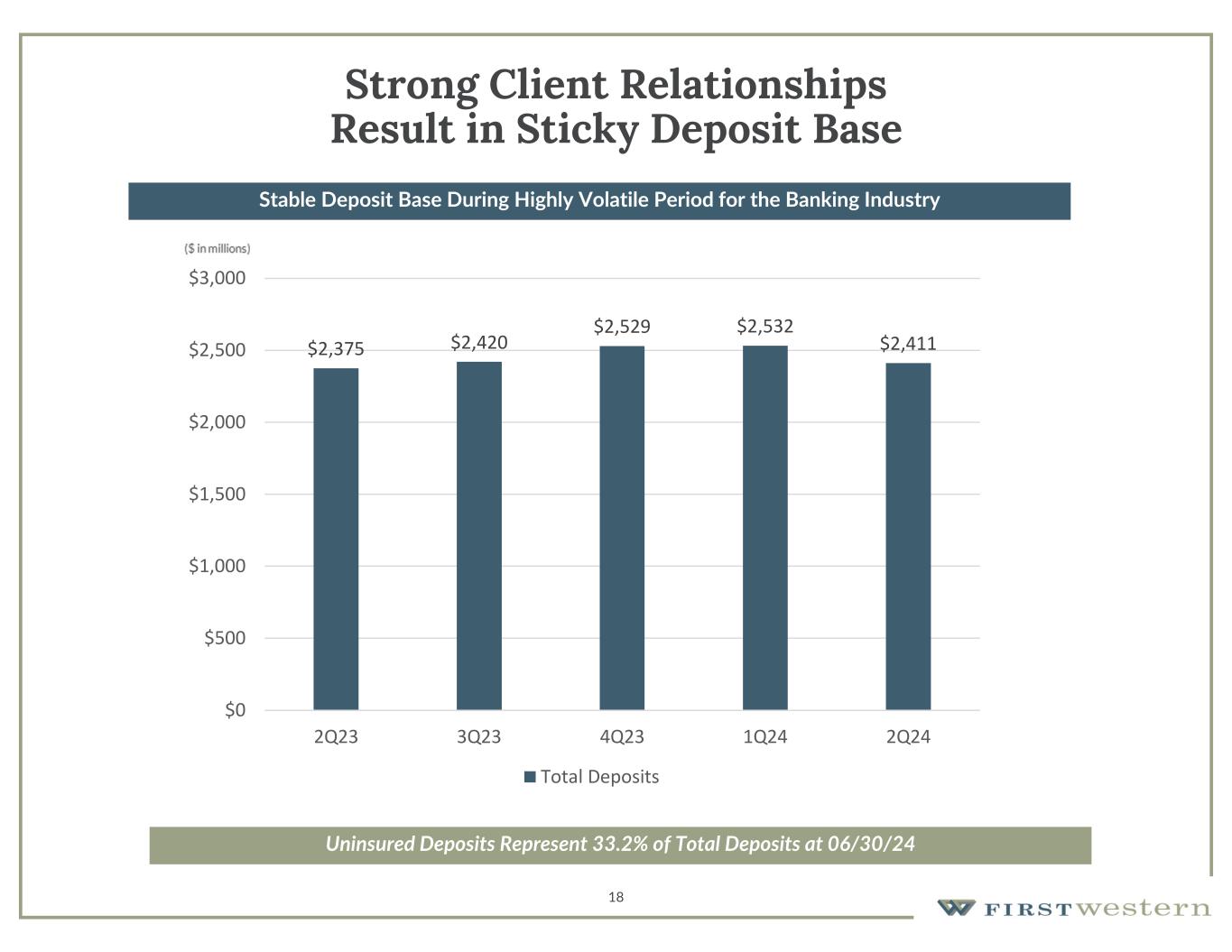 17 Long Track Record of Superior Credit Quality • Relationship-based approach, conservative underwriting criteria, and financial strength of clients have resulted in minimal credit losses over First Western’s history  Underwriting criteria includes three sources of repayment including personal guarantees  Low LTVs and high DSCRs  67% of borrowers have deposit accounts at First Western 0.0% 0.5% 1.0% 1.5% 2.0% 2009 2010 2011 2012 2013 2014 2015 2016 2017 2018 2019 2020 2021 2022 2023 Net Charge-offs as a Percent to Average Loans