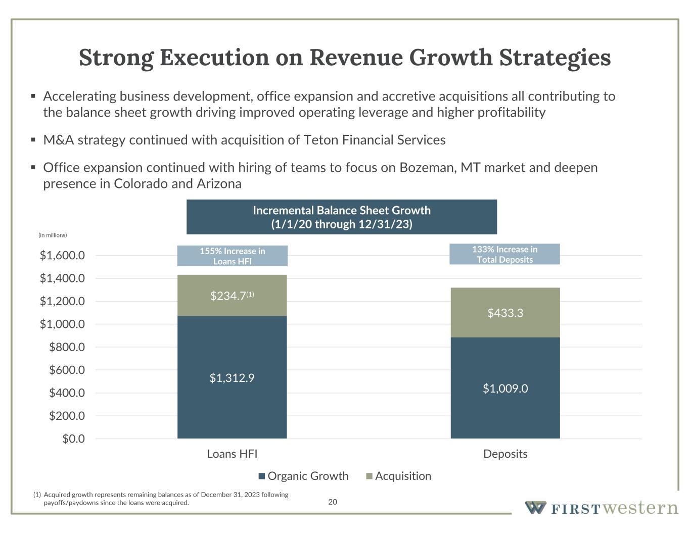 20 Strong Execution on Revenue Growth Strategies  Accelerating business development, office expansion and accretive acquisitions all contributing to the balance sheet growth driving improved operating leverage and higher profitability  M&A strategy continued with acquisition of Teton Financial Services  Office expansion continued with hiring of teams to focus on Bozeman, MT market and deepen presence in Colorado and Arizona (in millions) Incremental Balance Sheet Growth (1/1/20 through 12/31/23) $1,312.9 $1,009.0 $234.7(1) $433.3 $0.0 $200.0 $400.0 $600.0 $800.0 $1,000.0 $1,200.0 $1,400.0 $1,600.0 Loans HFI Deposits Organic Growth Acquisition 155% Increase in Loans HFI 133% Increase in Total Deposits (1) Acquired growth represents remaining balances as of December 31, 2023 following payoffs/paydowns since the loans were acquired.