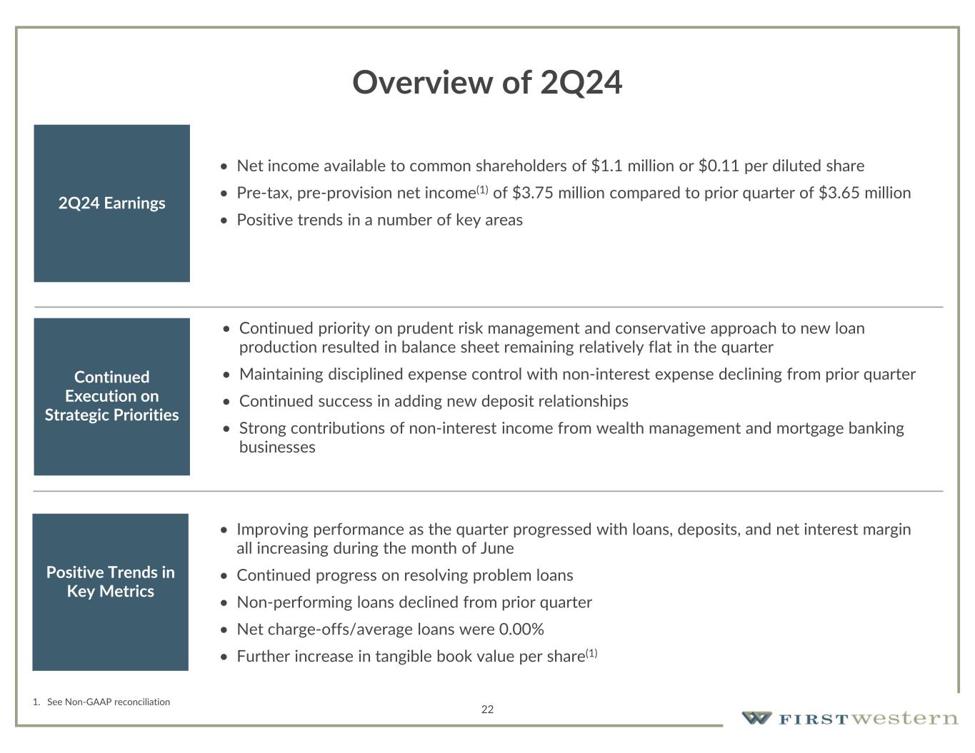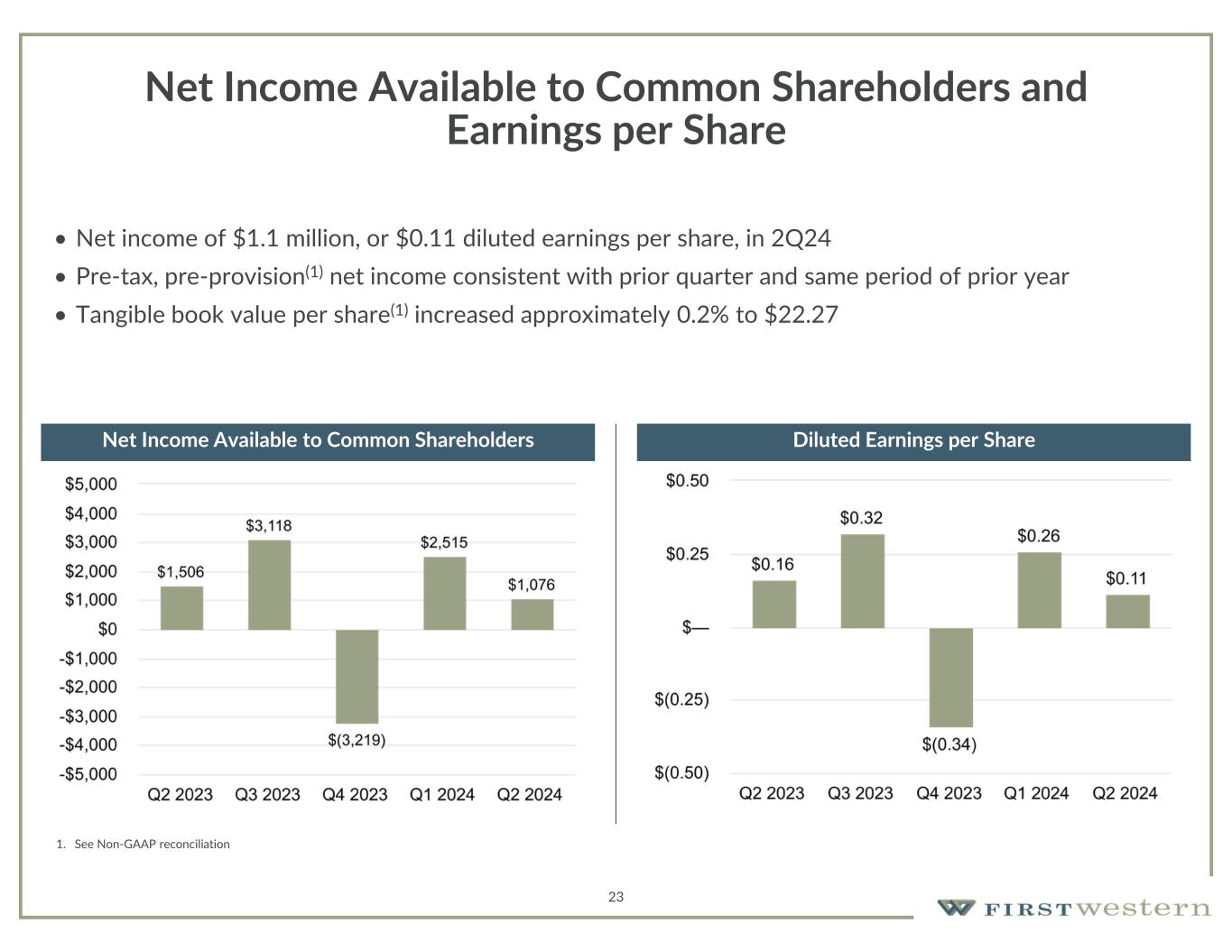 Overview of 2Q24 2Q24 Earnings • Net income available to common shareholders of $1.1 million or $0.11 per diluted share • Pre-tax, pre-provision net income(1) of $3.75 million compared to prior quarter of $3.65 million • Positive trends in a number of key areas Continued Execution on Strategic Priorities • Continued priority on prudent risk management and conservative approach to new loan production resulted in balance sheet remaining relatively flat in the quarter • Maintaining disciplined expense control with non-interest expense declining from prior quarter • Continued success in adding new deposit relationships • Strong contributions of non-interest income from wealth management and mortgage banking businesses Positive Trends in Key Metrics • Improving performance as the quarter progressed with loans, deposits, and net interest margin all increasing during the month of June • Continued progress on resolving problem loans • Non-performing loans declined from prior quarter • Net charge-offs/average loans were 0.00% • Further increase in tangible book value per share(1) 1. See Non-GAAP reconciliation 22