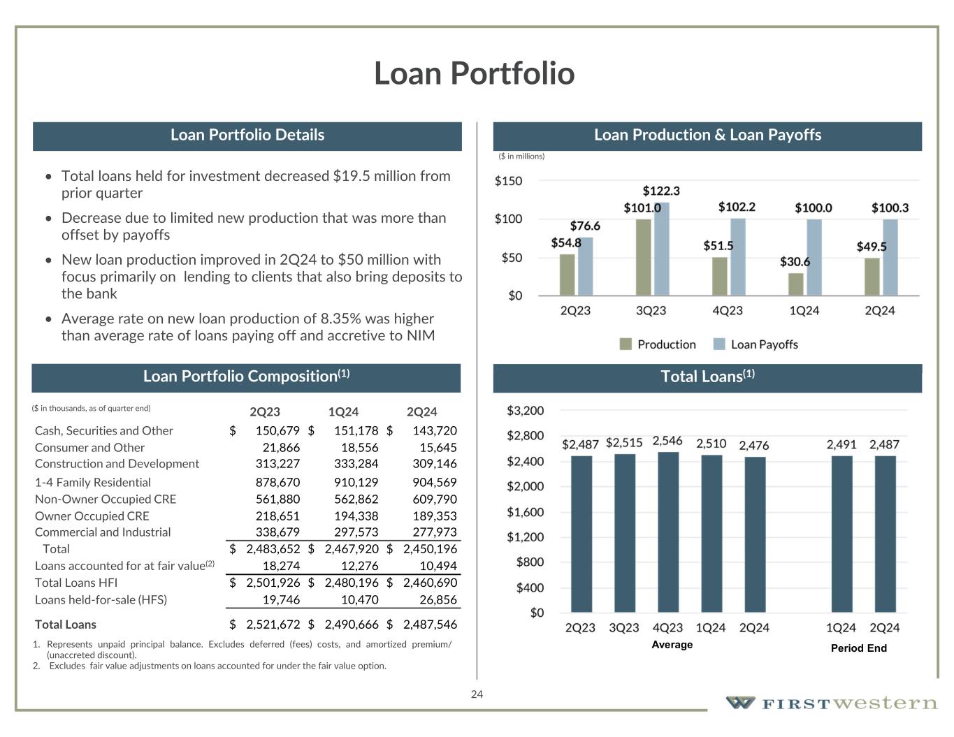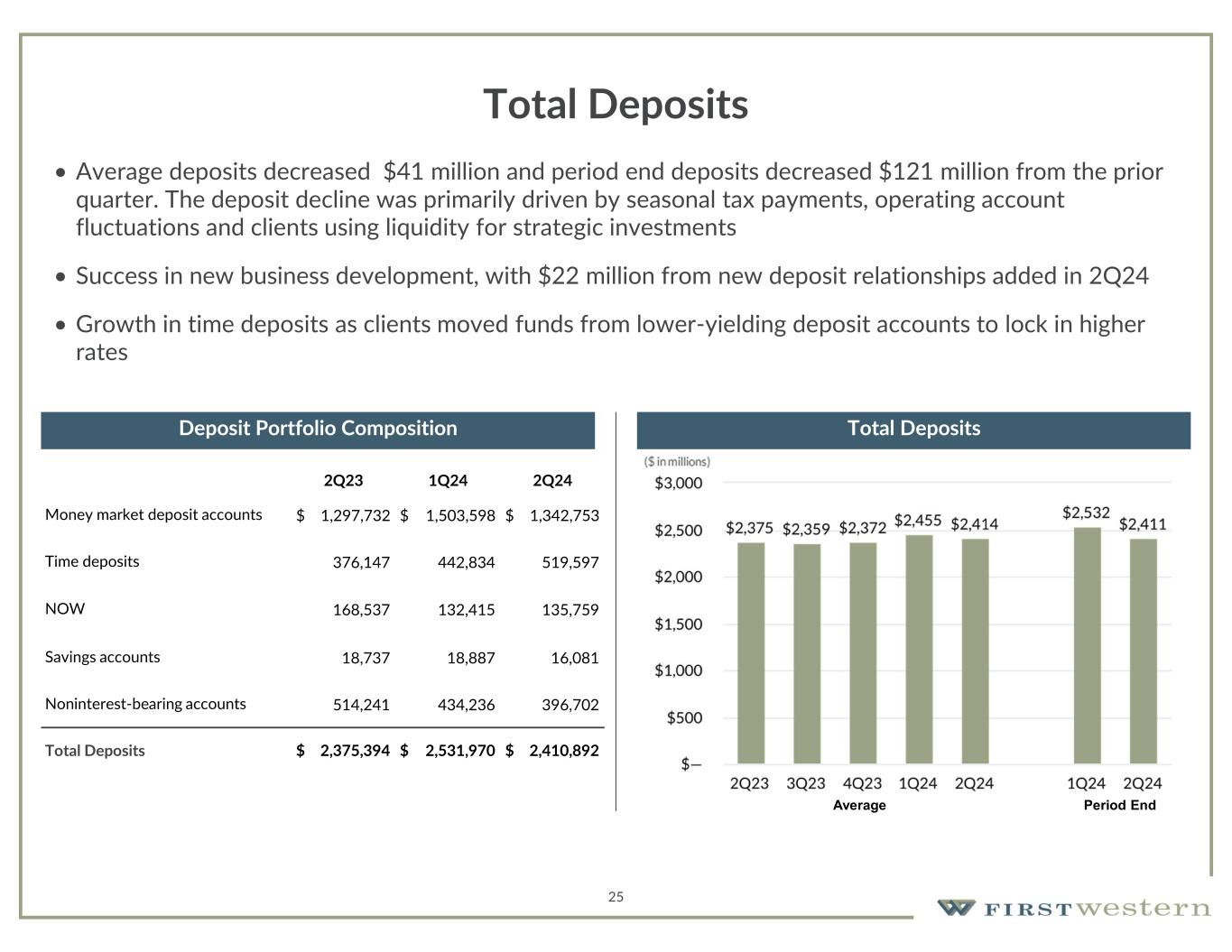24 Loan Portfolio • Total loans held for investment decreased $19.5 million from prior quarter • Decrease due to limited new production that was more than offset by payoffs • New loan production improved in 2Q24 to $50 million with focus primarily on lending to clients that also bring deposits to the bank • Average rate on new loan production of 8.35% was higher than average rate of loans paying off and accretive to NIM 2Q241Q242Q23 $ 143,720$ 151,178$ 150,679Cash, Securities and Other 15,64518,55621,866Consumer and Other 309,146333,284313,227Construction and Development 904,569910,129878,6701-4 Family Residential 609,790562,862561,880Non-Owner Occupied CRE 189,353194,338218,651Owner Occupied CRE 277,973297,573338,679Commercial and Industrial $ 2,450,196$ 2,467,920$ 2,483,652Total 10,49412,27618,274Loans accounted for at fair value(2) $ 2,460,690$ 2,480,196$ 2,501,926Total Loans HFI 26,85610,47019,746Loans held-for-sale (HFS) $ 2,487,546$ 2,490,666$ 2,521,672Total Loans 1. Represents unpaid principal balance. Excludes deferred (fees) costs, and amortized premium/ (unaccreted discount). 2. Excludes fair value adjustments on loans accounted for under the fair value option. ($ in thousands, as of quarter end) Loan Portfolio Composition(1) Loan Portfolio Details Loan Production & Loan Payoffs Total Loans(1) Average Period End ($ in millions)