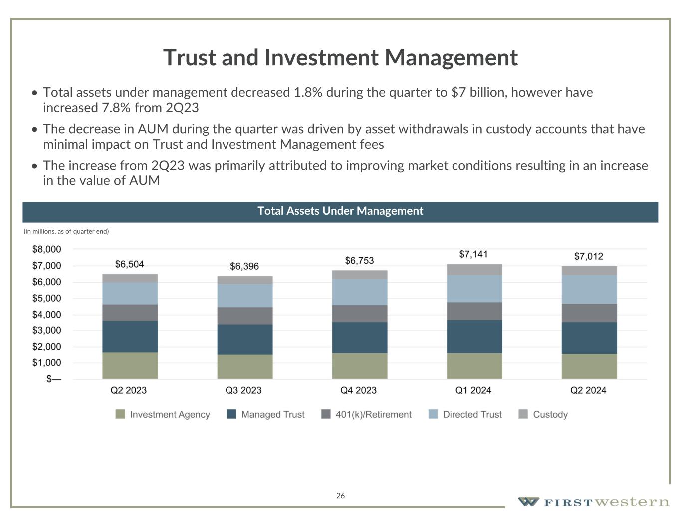 26 Trust and Investment Management • Total assets under management decreased 1.8% during the quarter to $7 billion, however have increased 7.8% from 2Q23 • The decrease in AUM during the quarter was driven by asset withdrawals in custody accounts that have minimal impact on Trust and Investment Management fees • The increase from 2Q23 was primarily attributed to improving market conditions resulting in an increase in the value of AUM (in millions, as of quarter end) Total Assets Under Management