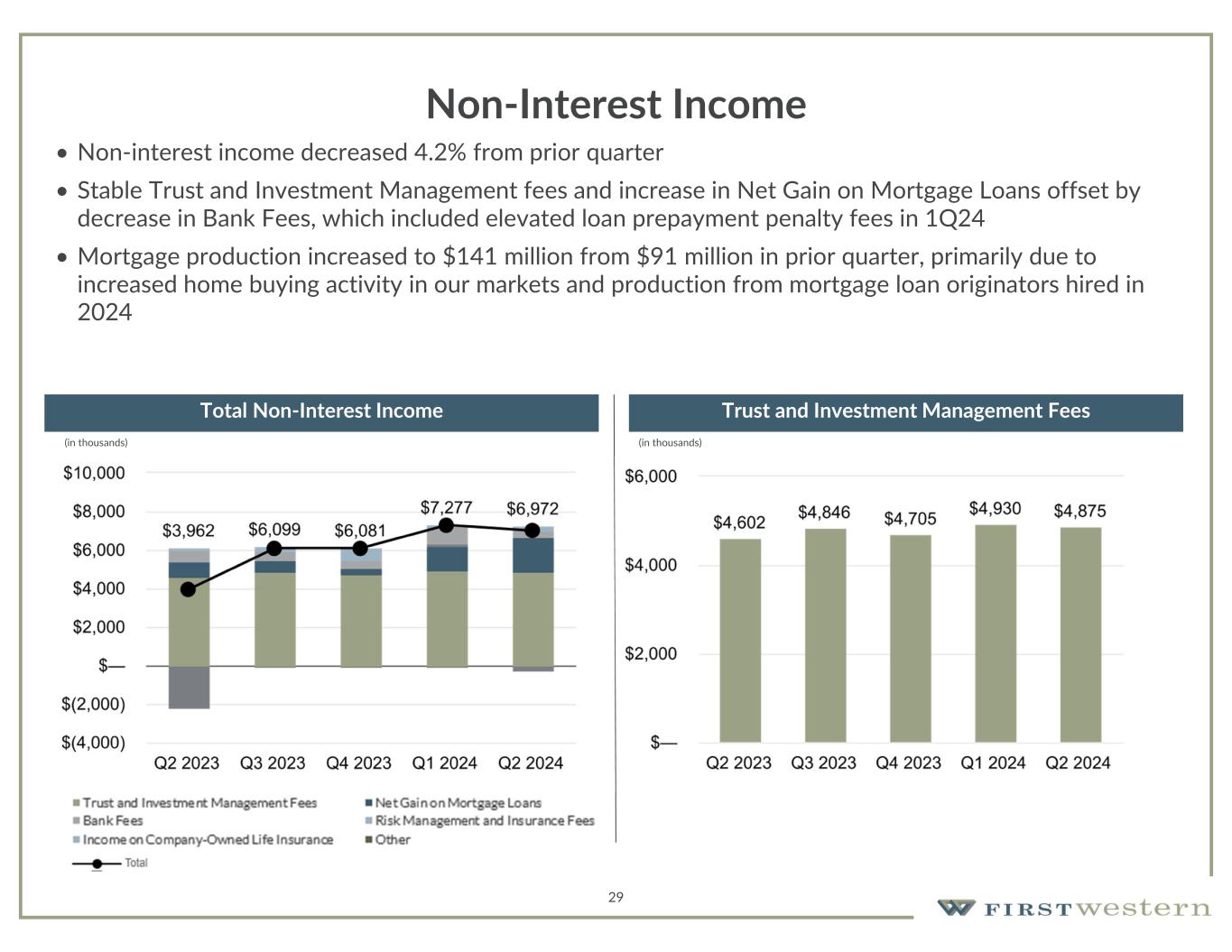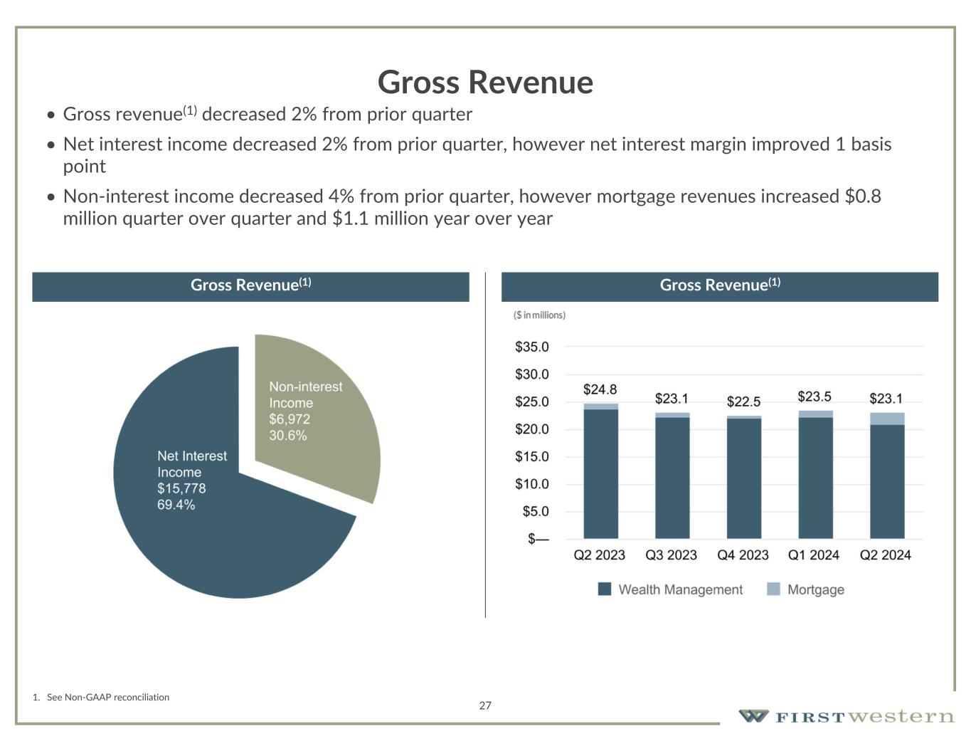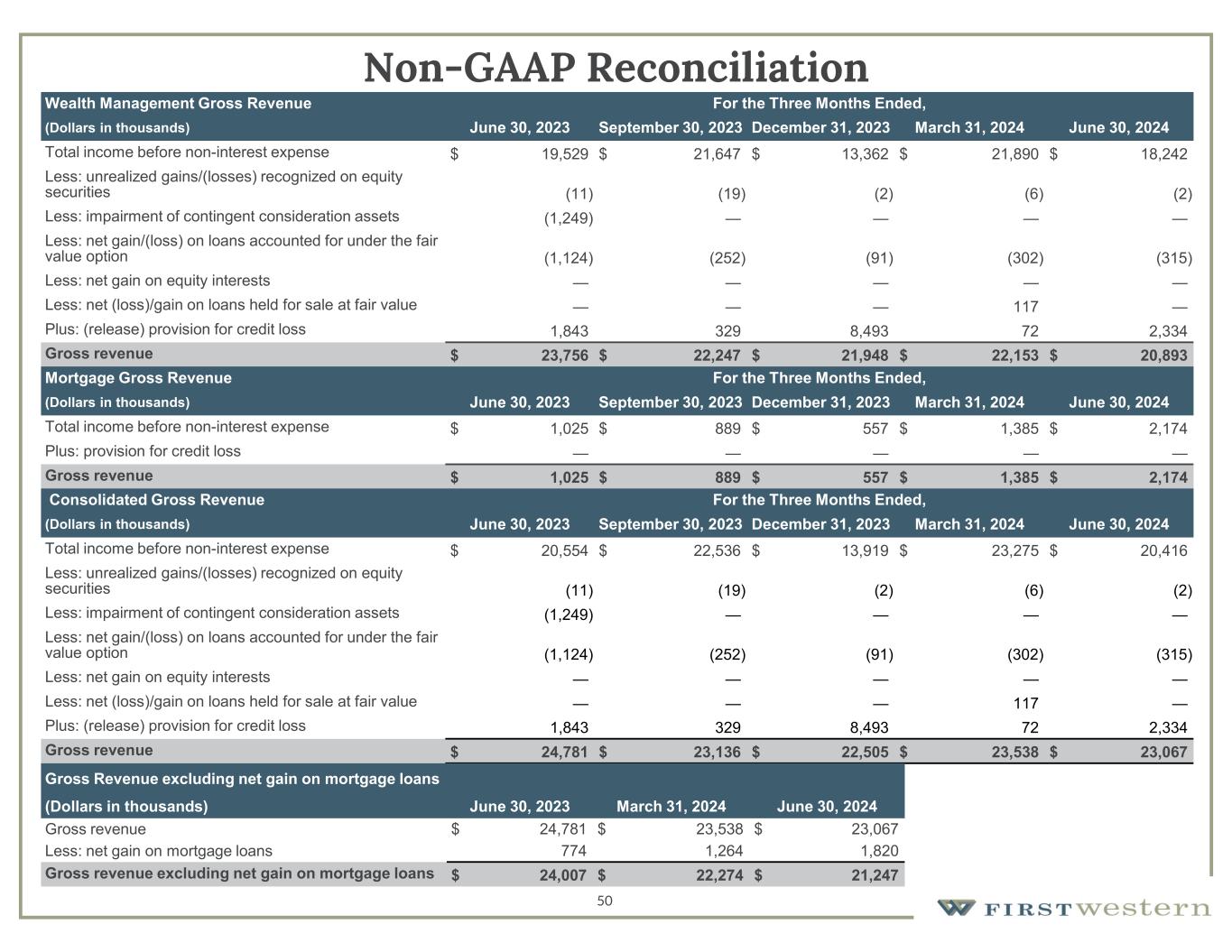 50 Non-GAAP Reconciliation For the Three Months Ended,Wealth Management Gross Revenue June 30, 2024March 31, 2024December 31, 2023September 30, 2023June 30, 2023(Dollars in thousands) $ 18,242$ 21,890$ 13,362$ 21,647$ 19,529Total income before non-interest expense (2)(6)(2)(19)(11) Less: unrealized gains/(losses) recognized on equity securities ————(1,249)Less: impairment of contingent consideration assets (315)(302)(91)(252)(1,124) Less: net gain/(loss) on loans accounted for under the fair value option —————Less: net gain on equity interests —117———Less: net (loss)/gain on loans held for sale at fair value 2,334728,4933291,843Plus: (release) provision for credit loss $ 20,893$ 22,153$ 21,948$ 22,247$ 23,756Gross revenue For the Three Months Ended,Mortgage Gross Revenue June 30, 2024March 31, 2024December 31, 2023September 30, 2023June 30, 2023(Dollars in thousands) $ 2,174$ 1,385$ 557$ 889$ 1,025Total income before non-interest expense —————Plus: provision for credit loss $ 2,174$ 1,385$ 557$ 889$ 1,025Gross revenue For the Three Months Ended,Consolidated Gross Revenue June 30, 2024March 31, 2024December 31, 2023September 30, 2023June 30, 2023(Dollars in thousands) $ 20,416$ 23,275$ 13,919$ 22,536$ 20,554Total income before non-interest expense (2)(6)(2)(19)(11) Less: unrealized gains/(losses) recognized on equity securities ————(1,249)Less: impairment of contingent consideration assets (315)(302)(91)(252)(1,124) Less: net gain/(loss) on loans accounted for under the fair value option —————Less: net gain on equity interests —117———Less: net (loss)/gain on loans held for sale at fair value 2,334728,4933291,843Plus: (release) provision for credit loss $ 23,067$ 23,538$ 22,505$ 23,136$ 24,781Gross revenue Gross Revenue excluding net gain on mortgage loans June 30, 2024March 31, 2024June 30, 2023(Dollars in thousands) $ 23,067$ 23,538$ 24,781Gross revenue 1,8201,264774Less: net gain on mortgage loans $ 21,247$ 22,274$ 24,007Gross revenue excluding net gain on mortgage loans