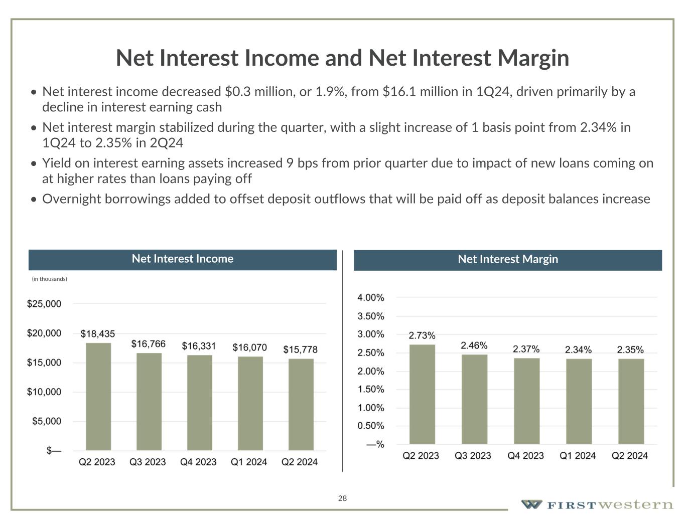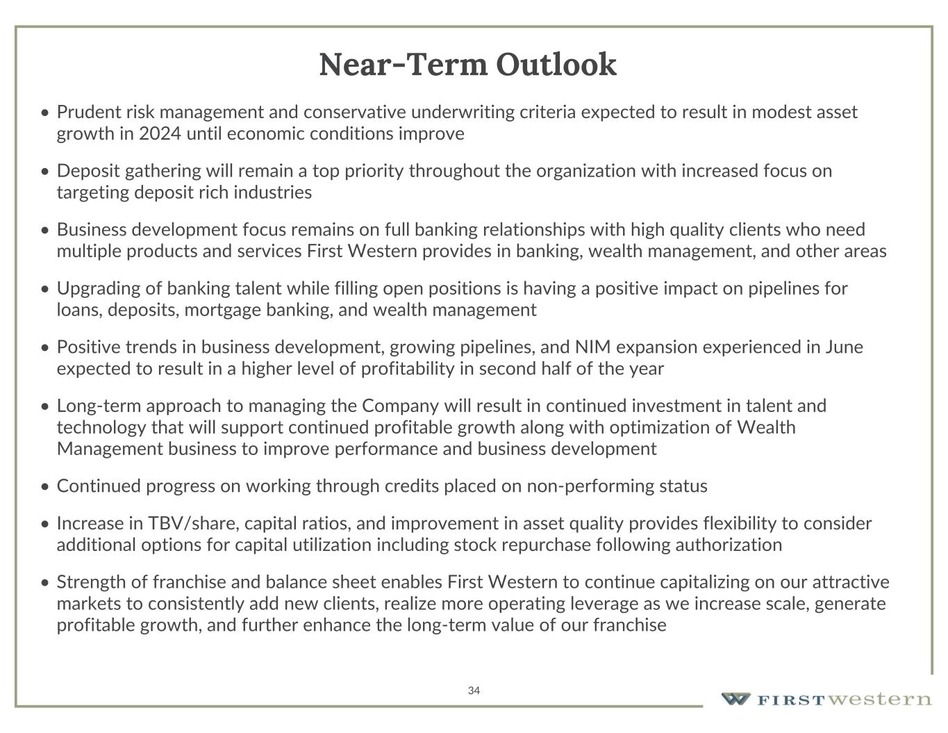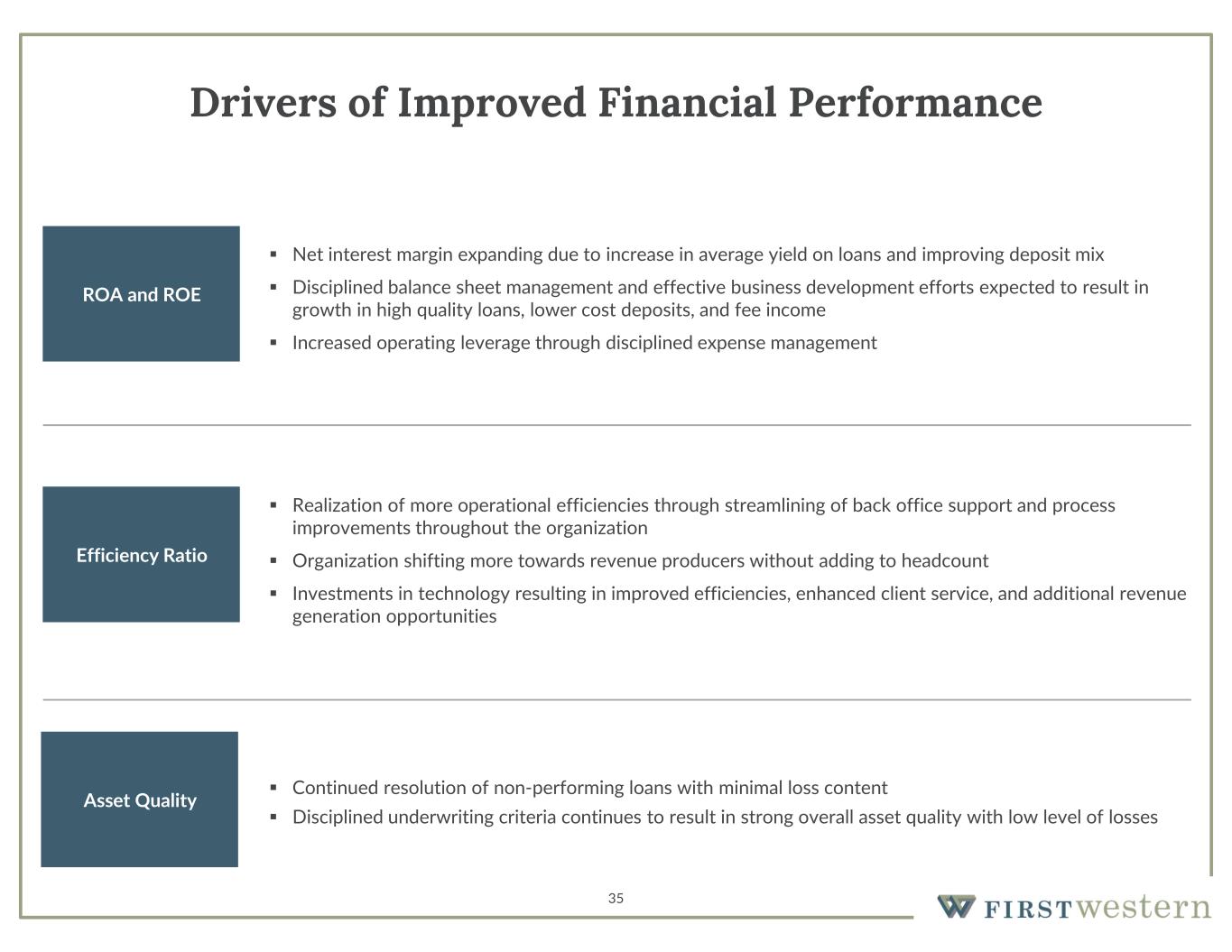 34 Near-Term Outlook • Prudent risk management and conservative underwriting criteria expected to result in modest asset growth in 2024 until economic conditions improve • Deposit gathering will remain a top priority throughout the organization with increased focus on targeting deposit rich industries • Business development focus remains on full banking relationships with high quality clients who need multiple products and services First Western provides in banking, wealth management, and other areas • Upgrading of banking talent while filling open positions is having a positive impact on pipelines for loans, deposits, mortgage banking, and wealth management • Positive trends in business development, growing pipelines, and NIM expansion experienced in June expected to result in a higher level of profitability in second half of the year • Long-term approach to managing the Company will result in continued investment in talent and technology that will support continued profitable growth along with optimization of Wealth Management business to improve performance and business development • Continued progress on working through credits placed on non-performing status • Increase in TBV/share, capital ratios, and improvement in asset quality provides flexibility to consider additional options for capital utilization including stock repurchase following authorization • Strength of franchise and balance sheet enables First Western to continue capitalizing on our attractive markets to consistently add new clients, realize more operating leverage as we increase scale, generate profitable growth, and further enhance the long-term value of our franchise