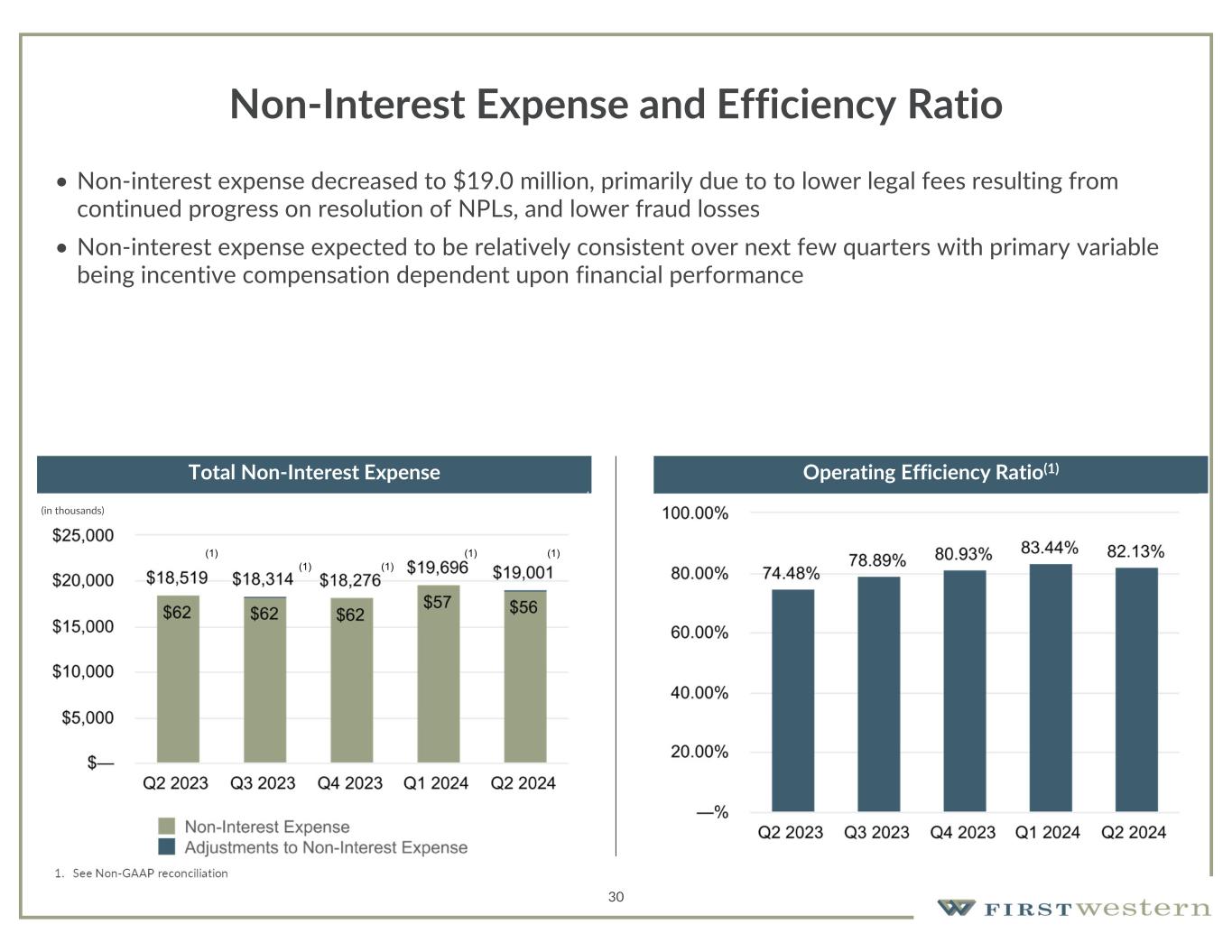 29 Non-Interest Income • Non-interest income decreased 4.2% from prior quarter • Stable Trust and Investment Management fees and increase in Net Gain on Mortgage Loans offset by decrease in Bank Fees, which included elevated loan prepayment penalty fees in 1Q24 • Mortgage production increased to $141 million from $91 million in prior quarter, primarily due to increased home buying activity in our markets and production from mortgage loan originators hired in 2024 (in thousands) Total Non-Interest Income Trust and Investment Management Fees (in thousands)