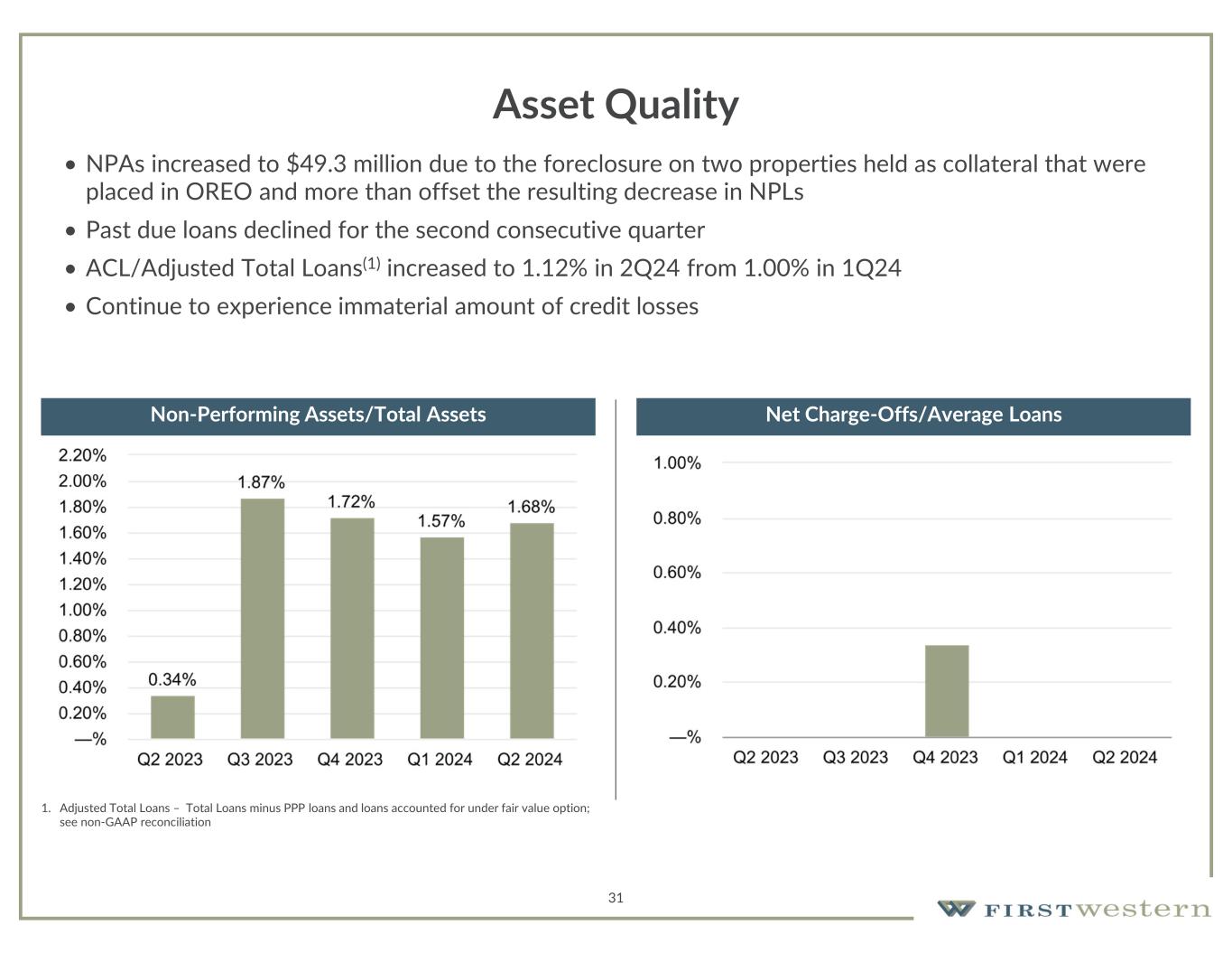30 Non-Interest Expense and Efficiency Ratio • Non-interest expense decreased to $19.0 million, primarily due to to lower legal fees resulting from continued progress on resolution of NPLs, and lower fraud losses • Non-interest expense expected to be relatively consistent over next few quarters with primary variable being incentive compensation dependent upon financial performance 1. See Non-GAAP reconciliation Total Non-Interest Expense Operating Efficiency Ratio(1) (in thousands) (1) (1) (1) (1) (1) (1)(1) (1)