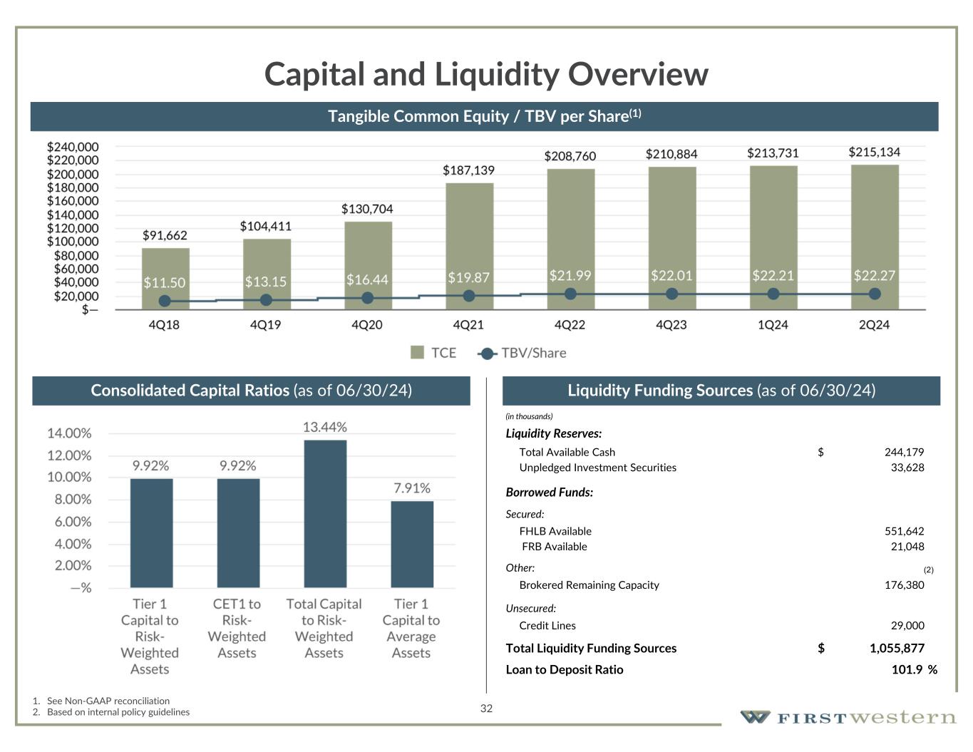 31 Asset Quality • NPAs increased to $49.3 million due to the foreclosure on two properties held as collateral that were placed in OREO and more than offset the resulting decrease in NPLs • Past due loans declined for the second consecutive quarter • ACL/Adjusted Total Loans(1) increased to 1.12% in 2Q24 from 1.00% in 1Q24 • Continue to experience immaterial amount of credit losses Non-Performing Assets/Total Assets Net Charge-Offs/Average Loans 1. Adjusted Total Loans – Total Loans minus PPP loans and loans accounted for under fair value option; see non-GAAP reconciliation