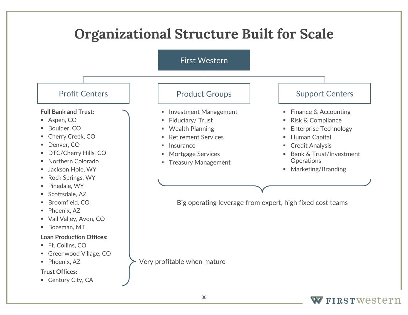 38 Organizational Structure Built for Scale Full Bank and Trust:  Aspen, CO  Boulder, CO  Cherry Creek, CO  Denver, CO  DTC/Cherry Hills, CO  Northern Colorado  Jackson Hole, WY  Rock Springs, WY  Pinedale, WY  Scottsdale, AZ  Broomfield, CO  Phoenix, AZ  Vail Valley, Avon, CO  Bozeman, MT Loan Production Offices:  Ft. Collins, CO  Greenwood Village, CO  Phoenix, AZ Trust Offices:  Century City, CA  Investment Management  Fiduciary/ Trust  Wealth Planning  Retirement Services  Insurance  Mortgage Services  Treasury Management First Western Profit Centers Product Groups Support Centers  Finance & Accounting  Risk & Compliance  Enterprise Technology  Human Capital  Credit Analysis  Bank & Trust/Investment Operations  Marketing/Branding Big operating leverage from expert, high fixed cost teams Very profitable when mature