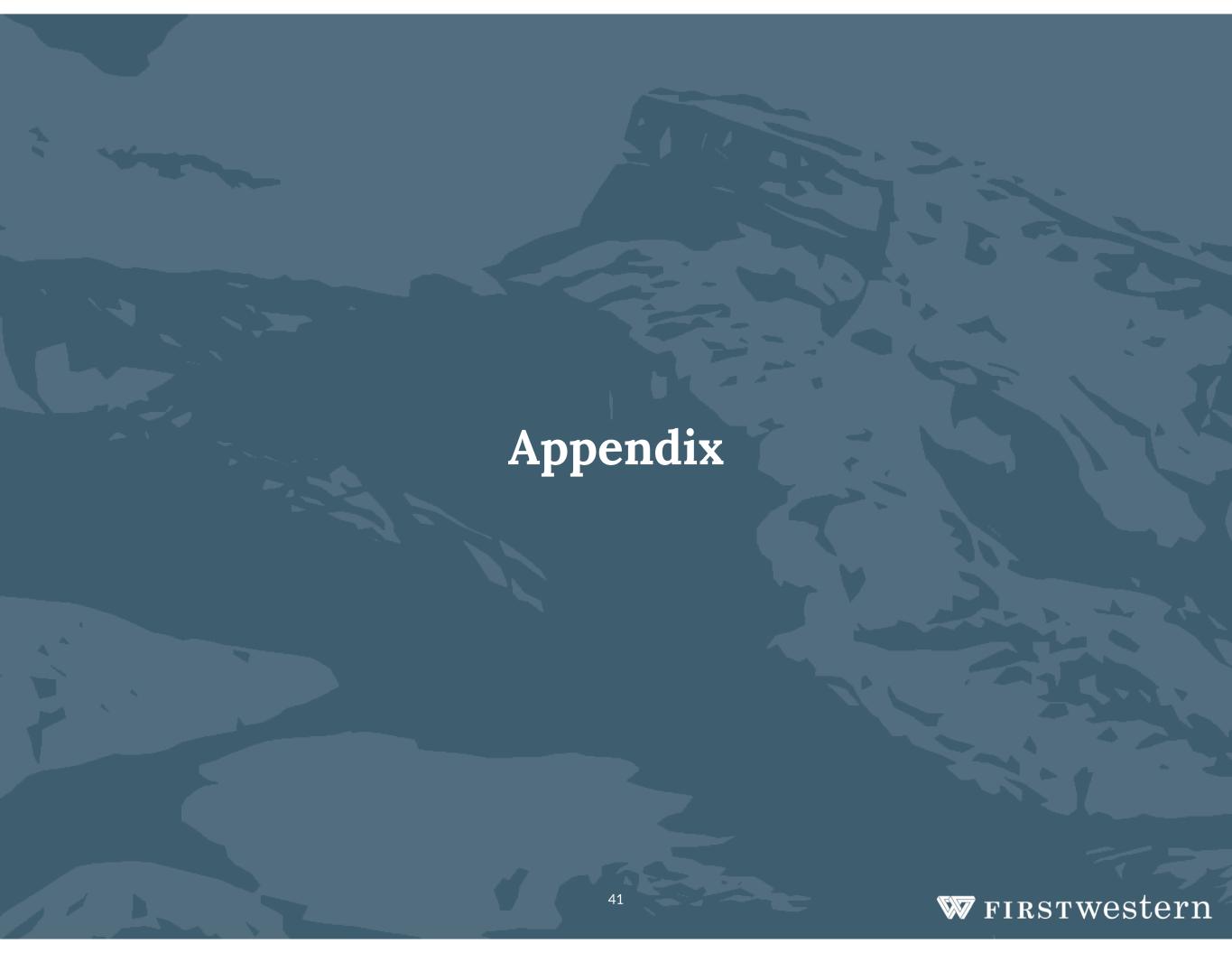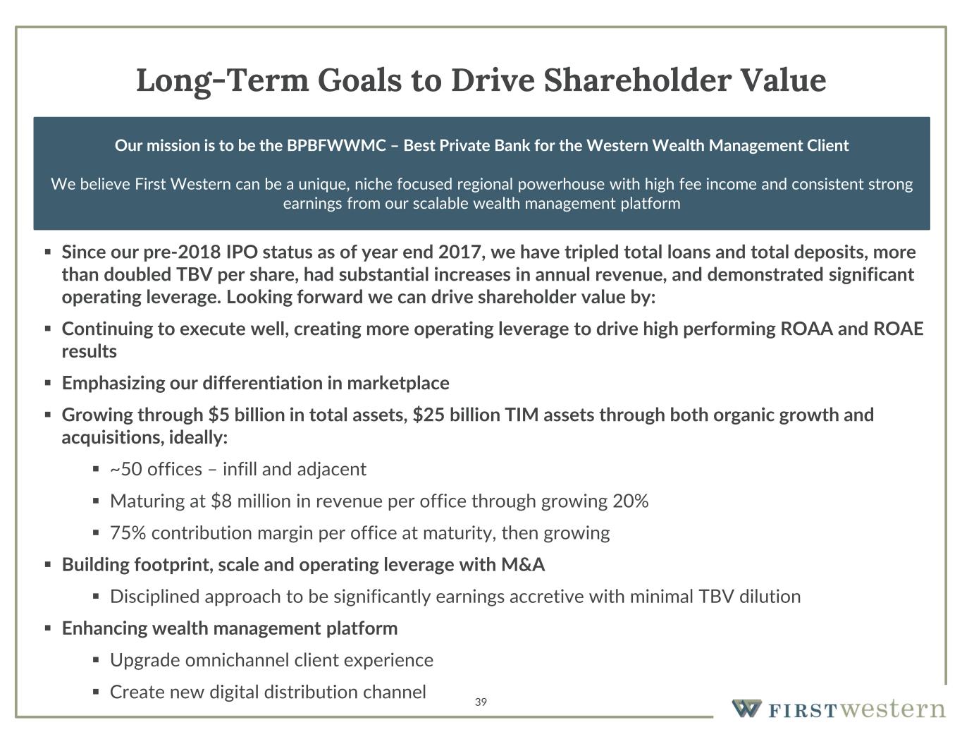 39 Long-Term Goals to Drive Shareholder Value  Since our pre-2018 IPO status as of year end 2017, we have tripled total loans and total deposits, more than doubled TBV per share, had substantial increases in annual revenue, and demonstrated significant operating leverage. Looking forward we can drive shareholder value by:  Continuing to execute well, creating more operating leverage to drive high performing ROAA and ROAE results  Emphasizing our differentiation in marketplace  Growing through $5 billion in total assets, $25 billion TIM assets through both organic growth and acquisitions, ideally:  ~50 offices – infill and adjacent  Maturing at $8 million in revenue per office through growing 20%  75% contribution margin per office at maturity, then growing  Building footprint, scale and operating leverage with M&A  Disciplined approach to be significantly earnings accretive with minimal TBV dilution  Enhancing wealth management platform  Upgrade omnichannel client experience  Create new digital distribution channel Our mission is to be the BPBFWWMC – Best Private Bank for the Western Wealth Management Client We believe First Western can be a unique, niche focused regional powerhouse with high fee income and consistent strong earnings from our scalable wealth management platform