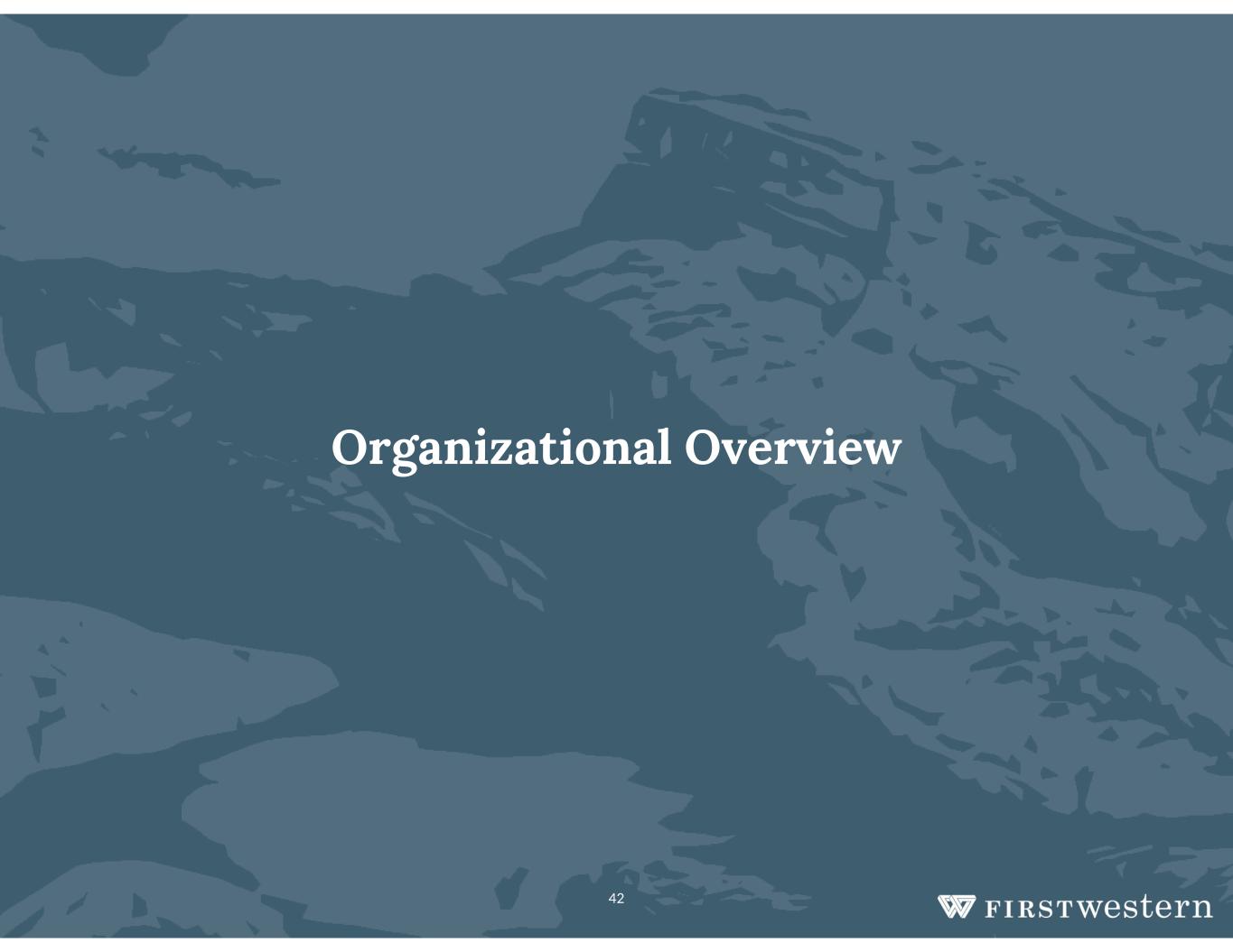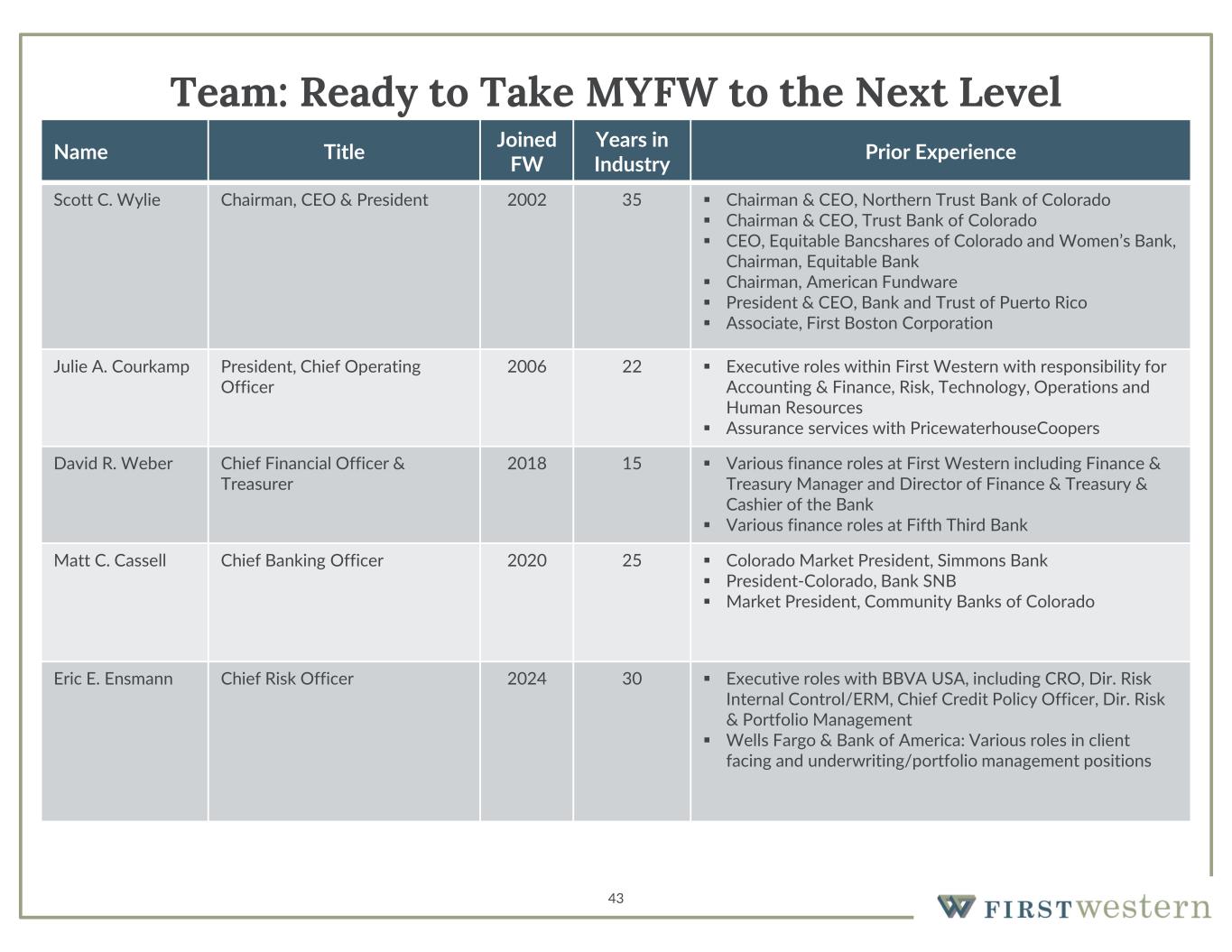 Prior ExperienceYears in Industry Joined FWTitleName  Chairman & CEO, Northern Trust Bank of Colorado  Chairman & CEO, Trust Bank of Colorado  CEO, Equitable Bancshares of Colorado and Women’s Bank, Chairman, Equitable Bank  Chairman, American Fundware  President & CEO, Bank and Trust of Puerto Rico  Associate, First Boston Corporation 352002Chairman, CEO & PresidentScott C. Wylie  Executive roles within First Western with responsibility for Accounting & Finance, Risk, Technology, Operations and Human Resources  Assurance services with PricewaterhouseCoopers 222006President, Chief Operating Officer Julie A. Courkamp  Various finance roles at First Western including Finance & Treasury Manager and Director of Finance & Treasury & Cashier of the Bank  Various finance roles at Fifth Third Bank 152018Chief Financial Officer & Treasurer David R. Weber  Colorado Market President, Simmons Bank  President-Colorado, Bank SNB  Market President, Community Banks of Colorado 252020Chief Banking OfficerMatt C. Cassell  Executive roles with BBVA USA, including CRO, Dir. Risk Internal Control/ERM, Chief Credit Policy Officer, Dir. Risk & Portfolio Management  Wells Fargo & Bank of America: Various roles in client facing and underwriting/portfolio management positions 302024Chief Risk OfficerEric E. Ensmann 43 Team: Ready to Take MYFW to the Next Level