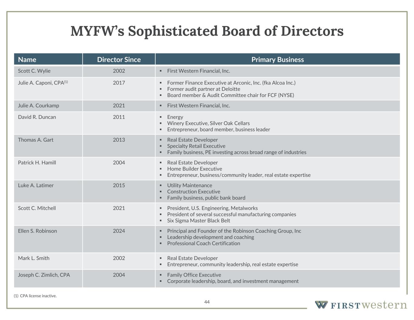 Primary BusinessDirector SinceName  First Western Financial, Inc.2002Scott C. Wylie  Former Finance Executive at Arconic, Inc. (fka Alcoa Inc.)  Former audit partner at Deloitte  Board member & Audit Committee chair for FCF (NYSE) 2017Julie A. Caponi, CPA(1)  First Western Financial, Inc.2021Julie A. Courkamp  Energy  Winery Executive, Silver Oak Cellars  Entrepreneur, board member, business leader 2011David R. Duncan  Real Estate Developer  Specialty Retail Executive  Family business, PE investing across broad range of industries 2013Thomas A. Gart  Real Estate Developer  Home Builder Executive  Entrepreneur, business/community leader, real estate expertise 2004Patrick H. Hamill  Utility Maintenance  Construction Executive  Family business, public bank board 2015Luke A. Latimer  President, U.S. Engineering, Metalworks  President of several successful manufacturing companies  Six Sigma Master Black Belt 2021Scott C. Mitchell  Principal and Founder of the Robinson Coaching Group, Inc  Leadership development and coaching  Professional Coach Certification 2024Ellen S. Robinson  Real Estate Developer  Entrepreneur, community leadership, real estate expertise 2002Mark L. Smith  Family Office Executive  Corporate leadership, board, and investment management 2004Joseph C. Zimlich, CPA 44 MYFW’s Sophisticated Board of Directors (1) CPA license inactive.
