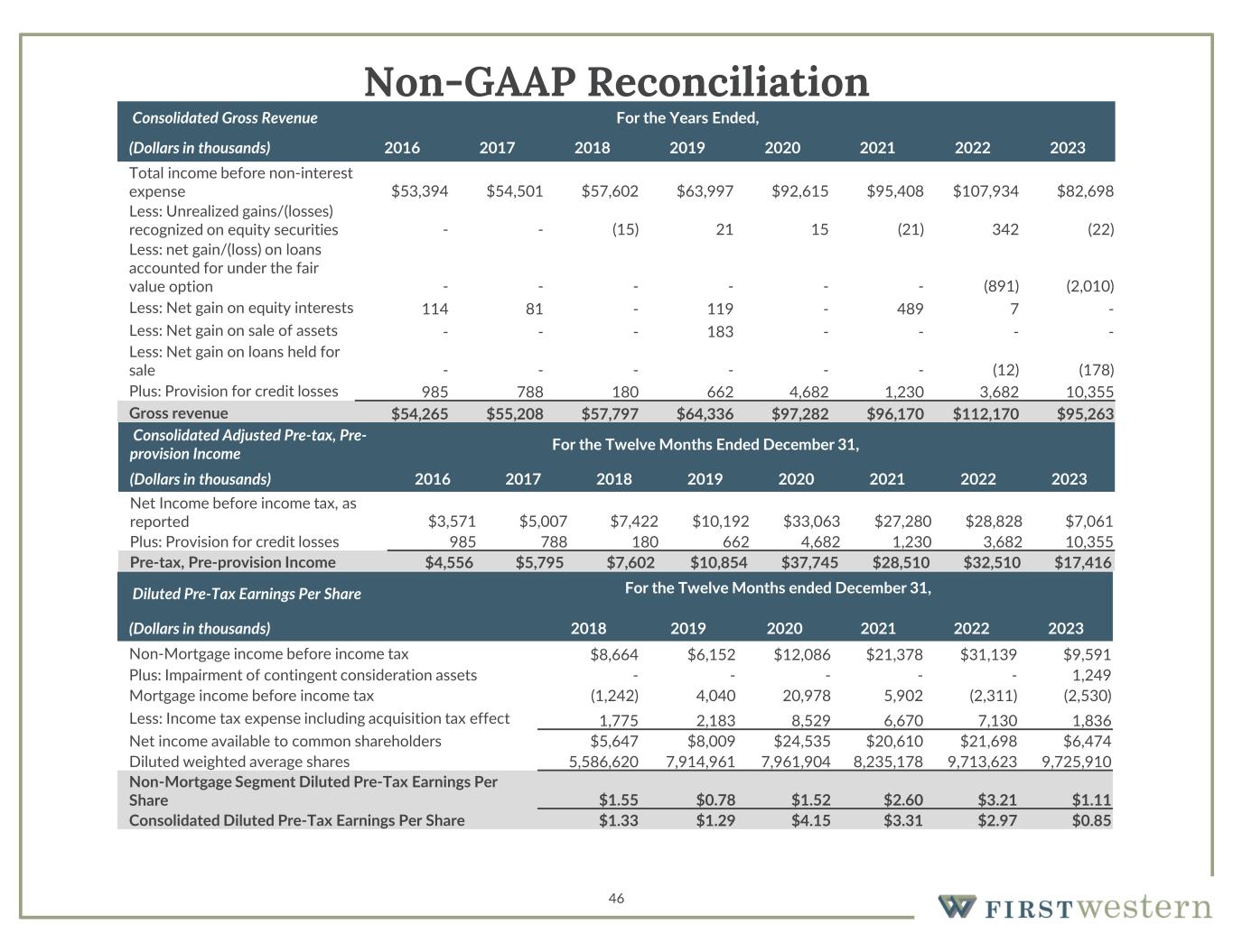 46 Non-GAAP Reconciliation For the Years Ended,Consolidated Gross Revenue 20232022202120202019201820172016(Dollars in thousands) $82,698$107,934$95,408$92,615$63,997$57,602$54,501$53,394 Total income before non-interest expense (22)342(21)1521(15)-- Less: Unrealized gains/(losses) recognized on equity securities (2,010)(891)------ Less: net gain/(loss) on loans accounted for under the fair value option -7489-119-81114Less: Net gain on equity interests ----183---Less: Net gain on sale of assets (178)(12)------ Less: Net gain on loans held for sale 10,3553,6821,2304,682662180788985Plus: Provision for credit losses $95,263$112,170$96,170$97,282$64,336$57,797$55,208$54,265Gross revenue For the Twelve Months Ended December 31,Consolidated Adjusted Pre-tax, Pre- provision Income 20232022202120202019201820172016(Dollars in thousands) $7,061$28,828$27,280$33,063$10,192$7,422$5,007$3,571 Net Income before income tax, as reported 10,3553,6821,2304,682662180788 985 Plus: Provision for credit losses $17,416$32,510$28,510$37,745$10,854$7,602$5,795 $4,556 Pre-tax, Pre-provision Income For the Twelve Months ended December 31,Diluted Pre-Tax Earnings Per Share 202320222021202020192018(Dollars in thousands) $9,591$31,139$21,378$12,086$6,152$8,664Non-Mortgage income before income tax 1,249-----Plus: Impairment of contingent consideration assets (2,530)(2,311)5,90220,9784,040(1,242)Mortgage income before income tax 1,8367,1306,6708,5292,1831,775Less: Income tax expense including acquisition tax effect $6,474$21,698$20,610$24,535$8,009$5,647Net income available to common shareholders 9,725,9109,713,6238,235,1787,961,9047,914,9615,586,620Diluted weighted average shares $1.11$3.21$2.60$1.52$0.78$1.55 Non-Mortgage Segment Diluted Pre-Tax Earnings Per Share $0.85$2.97$3.31$4.15$1.29$1.33Consolidated Diluted Pre-Tax Earnings Per Share