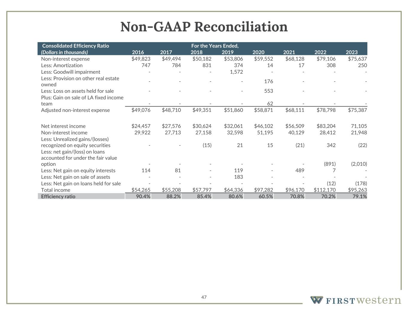 47 Non-GAAP Reconciliation For the Years Ended,Consolidated Efficiency Ratio 20232022202120202019201820172016(Dollars in thousands) $75,637$79,106$68,128$59,552$53,806$50,182$49,494$49,823Non-interest expense 2503081714374831784747Less: Amortization ----1,572---Less: Goodwill impairment ---176----Less: Provision on other real estate owned ---553----Less: Loss on assets held for sale ---62---- Plus: Gain on sale of LA fixed income team $75,387$78,798$68,111$58,871$51,860$49,351$48,710$49,076Adjusted non-interest expense 71,105$83,204$56,509$46,102$32,061$30,624$27,576$24,457Net interest income 21,94828,41240,12951,19532,59827,15827,71329,922Non-interest income (22)342(21)1521(15)-- Less: Unrealized gains/(losses) recognized on equity securities (2,010)(891)------ Less: net gain/(loss) on loans accounted for under the fair value option -7489-119-81114Less: Net gain on equity interests ----183---Less: Net gain on sale of assets (178)(12)------Less: Net gain on loans held for sale $95,263$112,170$96,170$97,282$64,336$57,797$55,208$54,265Total income 79.1%70.2%70.8%60.5%80.6%85.4%88.2%90.4%Efficiency ratio