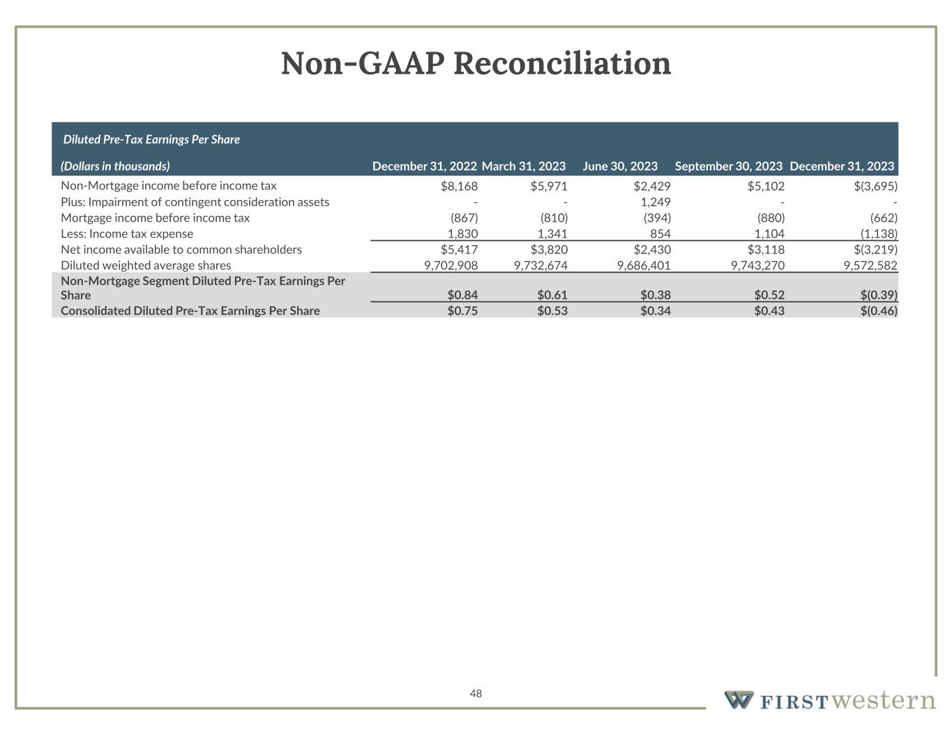 48 Non-GAAP Reconciliation Diluted Pre-Tax Earnings Per Share December 31, 2023September 30, 2023June 30, 2023March 31, 2023December 31, 2022(Dollars in thousands) $(3,695)$5,102$2,429$5,971$8,168Non-Mortgage income before income tax --1,249--Plus: Impairment of contingent consideration assets (662)(880)(394)(810)(867)Mortgage income before income tax (1,138)1,1048541,3411,830Less: Income tax expense $(3,219)$3,118$2,430$3,820$5,417Net income available to common shareholders 9,572,5829,743,2709,686,4019,732,6749,702,908Diluted weighted average shares $(0.39)$0.52$0.38$0.61$0.84 Non-Mortgage Segment Diluted Pre-Tax Earnings Per Share $(0.46)$0.43$0.34$0.53$0.75Consolidated Diluted Pre-Tax Earnings Per Share