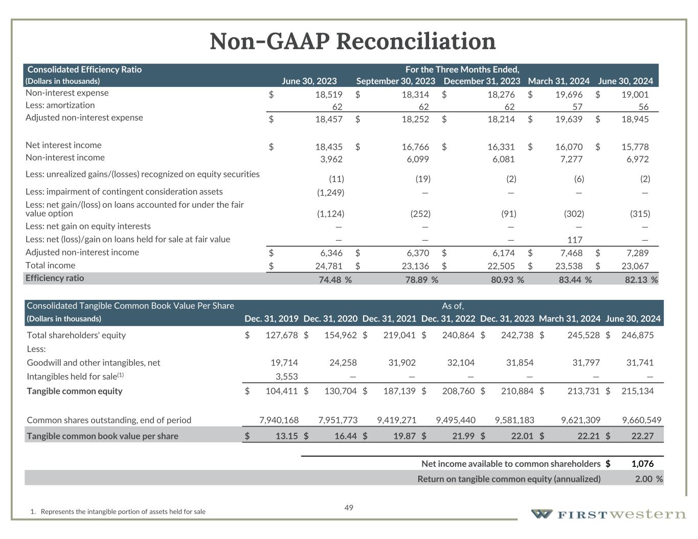 49 Non-GAAP Reconciliation As of,Consolidated Tangible Common Book Value Per Share June 30, 2024March 31, 2024Dec. 31, 2023Dec. 31, 2022Dec. 31, 2021Dec. 31, 2020Dec. 31, 2019(Dollars in thousands) $ 246,875$ 245,528$ 242,738$ 240,864$ 219,041$ 154,962$ 127,678Total shareholders' equity Less: 31,74131,79731,85432,10431,90224,25819,714Goodwill and other intangibles, net ——————3,553Intangibles held for sale(1) $ 215,134$ 213,731$ 210,884$ 208,760$ 187,139$ 130,704$ 104,411Tangible common equity 9,660,5499,621,3099,581,1839,495,4409,419,2717,951,7737,940,168Common shares outstanding, end of period $ 22.27$ 22.21$ 22.01$ 21.99$ 19.87$ 16.44$ 13.15Tangible common book value per share $ 1,076Net income available to common shareholders 2.00 %Return on tangible common equity (annualized) 1. Represents the intangible portion of assets held for sale For the Three Months Ended,Consolidated Efficiency Ratio June 30, 2024March 31, 2024December 31, 2023September 30, 2023June 30, 2023(Dollars in thousands) $ 19,001$ 19,696$ 18,276$ 18,314$ 18,519Non-interest expense 5657626262Less: amortization $ 18,945$ 19,639$ 18,214$ 18,252$ 18,457Adjusted non-interest expense $ 15,778$ 16,070$ 16,331$ 16,766$ 18,435Net interest income 6,9727,2776,0816,0993,962Non-interest income (2)(6)(2)(19)(11)Less: unrealized gains/(losses) recognized on equity securities ————(1,249)Less: impairment of contingent consideration assets (315)(302)(91)(252)(1,124) Less: net gain/(loss) on loans accounted for under the fair value option —————Less: net gain on equity interests —117———Less: net (loss)/gain on loans held for sale at fair value $ 7,289$ 7,468$ 6,174$ 6,370$ 6,346Adjusted non-interest income $ 23,067$ 23,538$ 22,505$ 23,136$ 24,781Total income 82.13 %83.44 %80.93 %78.89 %74.48 %Efficiency ratio