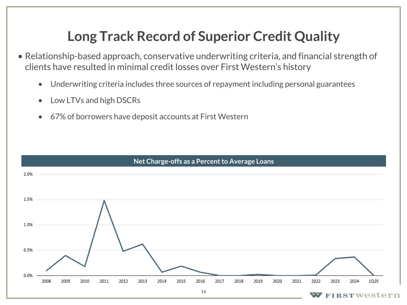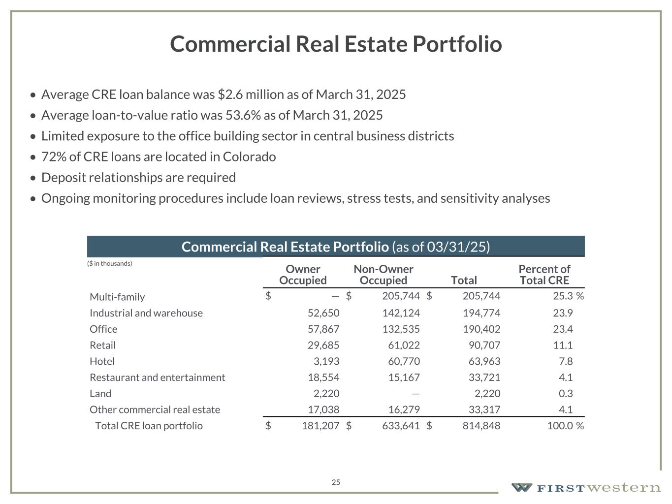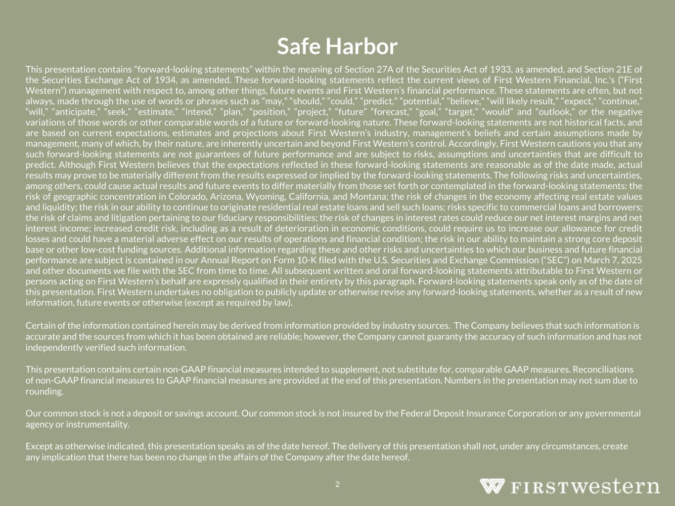 Safe Harbor 2 This presentation contains “forward-looking statements” within the meaning of Section 27A of the Securities Act of 1933, as amended, and Section 21E of the Securities Exchange Act of 1934, as amended. These forward-looking statements reflect the current views of First Western Financial, Inc.’s (“First Western”) management with respect to, among other things, future events and First Western’s financial performance. These statements are often, but not always, made through the use of words or phrases such as “may,” “should,” “could,” “predict,” “potential,” “believe,” “will likely result,” “expect,” “continue,” “will,” “anticipate,” “seek,” “estimate,” “intend,” “plan,” “position,” “project,” “future” “forecast,” “goal,” “target,” “would” and “outlook,” or the negative variations of those words or other comparable words of a future or forward-looking nature. These forward-looking statements are not historical facts, and are based on current expectations, estimates and projections about First Western’s industry, management’s beliefs and certain assumptions made by management, many of which, by their nature, are inherently uncertain and beyond First Western’s control. Accordingly, First Western cautions you that any such forward-looking statements are not guarantees of future performance and are subject to risks, assumptions and uncertainties that are difficult to predict. Although First Western believes that the expectations reflected in these forward-looking statements are reasonable as of the date made, actual results may prove to be materially different from the results expressed or implied by the forward-looking statements. The following risks and uncertainties, among others, could cause actual results and future events to differ materially from those set forth or contemplated in the forward-looking statements: the risk of geographic concentration in Colorado, Arizona, Wyoming, California, and Montana; the risk of changes in the economy affecting real estate values and liquidity; the risk in our ability to continue to originate residential real estate loans and sell such loans; risks specific to commercial loans and borrowers; the risk of claims and litigation pertaining to our fiduciary responsibilities; the risk of changes in interest rates could reduce our net interest margins and net interest income; increased credit risk, including as a result of deterioration in economic conditions, could require us to increase our allowance for credit losses and could have a material adverse effect on our results of operations and financial condition; the risk in our ability to maintain a strong core deposit base or other low-cost funding sources. Additional information regarding these and other risks and uncertainties to which our business and future financial performance are subject is contained in our Annual Report on Form 10-K filed with the U.S. Securities and Exchange Commission (“SEC”) on March 7, 2025 and other documents we file with the SEC from time to time. All subsequent written and oral forward-looking statements attributable to First Western or persons acting on First Western’s behalf are expressly qualified in their entirety by this paragraph. Forward-looking statements speak only as of the date of this presentation. First Western undertakes no obligation to publicly update or otherwise revise any forward-looking statements, whether as a result of new information, future events or otherwise (except as required by law). Certain of the information contained herein may be derived from information provided by industry sources. The Company believes that such information is accurate and the sources from which it has been obtained are reliable; however, the Company cannot guaranty the accuracy of such information and has not independently verified such information. This presentation contains certain non-GAAP financial measures intended to supplement, not substitute for, comparable GAAP measures. Reconciliations of non-GAAP financial measures to GAAP financial measures are provided at the end of this presentation. Numbers in the presentation may not sum due to rounding. Our common stock is not a deposit or savings account. Our common stock is not insured by the Federal Deposit Insurance Corporation or any governmental agency or instrumentality. Except as otherwise indicated, this presentation speaks as of the date hereof. The delivery of this presentation shall not, under any circumstances, create any implication that there has been no change in the affairs of the Company after the date hereof.