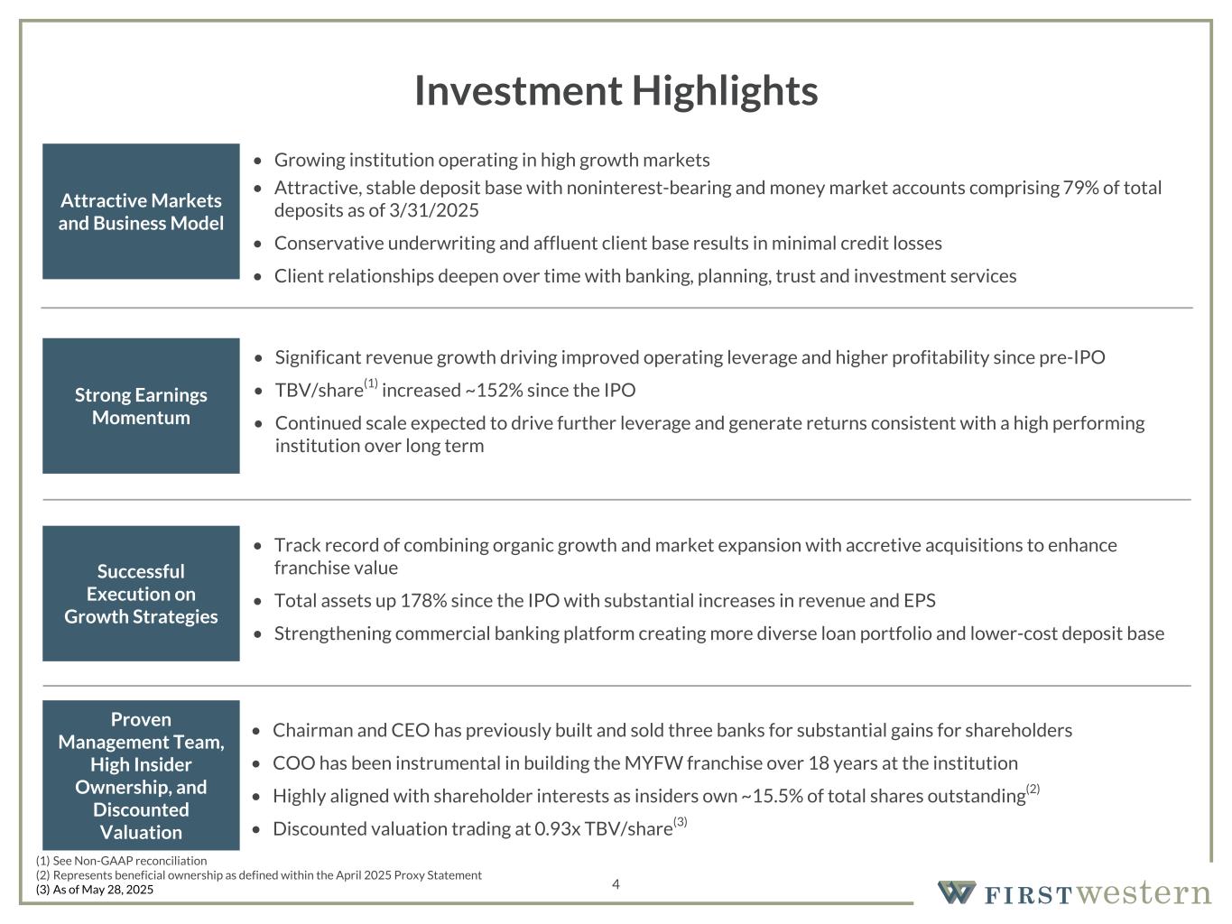 157 180 196 164 166 168 62 94 111 154 161 132 122 125 129 76 78 86 255 255 255 Chart color Table color Special Headlines Slide Headlines / Text on light background Primary Colors Secondary Colors Primary Background / Call Out Boxes / Text on dark background Chart color Table Color Tertiary Colors Chart color Table Color Chart Color Chart Color Approved Fonts AaBbCc 123 Lora (bold) Slide Headlines / Special Headlines AaBbCc 123 Lato (regular, bold, italics) Body Copy / Subheadings / Small Text Descriptions 3 A Unique Financial Institution in Attractive Markets Overview • Niche-focused regional wealth manager built on a private trust bank platform • Headquartered in Denver, Colorado and positioned in desirable, affluent and high growth markets Target Market • Households of $1+ million liquid net worth • Focus on entrepreneurs and investors brings commercial bank and fee business • High net worth and high growth markets • Unique focus on attractive Rocky Mountain footprint Company Highlights Competitive Advantage (as of 3/31/2025) • Assets: $2.91 billion • Total Loans: $2.43 billion • Total Deposits: $2.52 billion • AUM: $7.18 billion • Operates as one integrated firm, not silos • Team approach benefits both clients and First Western • Local boutique private trust bank offices with central product experts • Named one of 16 U.S. banks with industry leading performance over the last decade