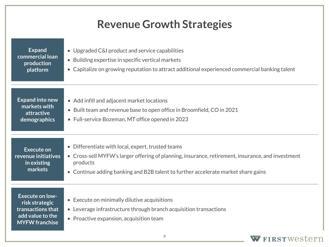 157 180 196 164 166 168 62 94 111 154 161 132 122 125 129 76 78 86 255 255 255 Chart color Table color Special Headlines Slide Headlines / Text on light background Primary Colors Secondary Colors Primary Background / Call Out Boxes / Text on dark background Chart color Table Color Tertiary Colors Chart color Table Color Chart Color Chart Color Approved Fonts AaBbCc 123 Lora (bold) Slide Headlines / Special Headlines AaBbCc 123 Lato (regular, bold, italics) Body Copy / Subheadings / Small Text Descriptions 8 Success in Expansion and Acquisition Growth 2006 – 2010 (3) • Boulder, CO • Century City, CA • Scottsdale, AZ 2011 – 2015 (6) • Aspen, CO • DTC/Cherry Hills, CO • Fort Collins, CO • Jackson Hole, WY • Laramie, WY(4) • Phoenix, AZ 2016 – 2020 (4) • Broomfield, CO (2021) • Greenwood Village, CO • Lone Tree, CO(2) • Vail Valley, CO 2002 – 2005 (3) • Cherry Creek, CO • Denver, CO • Northern Colorado, CO 2002 – 2005 (5) • Westcor Insurance Group, Inc. • Poudre River Valley Trust Co. • Sprout & Associates, Inc. • Sterling Partners • Silversmith Financial Corp 2006 – 2010 (4) • Reber/Russell Company • Ryder, Stilwell Inc. • Asset Purchase – Financial Management Advisors, LLC • Asset Purchase – GKM Advisors, LLC 2011 – 2015 (1) • Trust Department Assets – First National Bank of Wyoming 2016 – 2020 (2) • Asset Purchase – EMC Holdings, Inc. • Branch Purchase & Assumption from Simmons Bank O ff ic e O p en in gs A cq u is it io n s 2002 2025 3 5 6 9 12 10 16 12 # #Total Acquisitions Total Offices 19 13 2021 - 2022 (1) • Teton Financial Services, Inc. 2021 - 2024 (7) • Jackson Hole, WY(1) • Pinedale, WY(1) • Rock Springs, WY(1) • Bozeman, MT(5) • Phoenix, AZ(3) • Cheyenne, WY(6) • Loveland, CO(6) (1) Added through the Teton Financial Services, Inc. acquisition. Jackson Hole offices were consolidated in May 2022 (2) Lone Tree office closed in 2Q2022 (3) Phoenix loan production office closed in 1Q2025 (4) Laramie trust office closed 1Q2023 (5) Bozeman office expanded from a loan production office to a full-service office in 3Q2023 (6) Cheyenne and Loveland loan production offices opened in Q32024