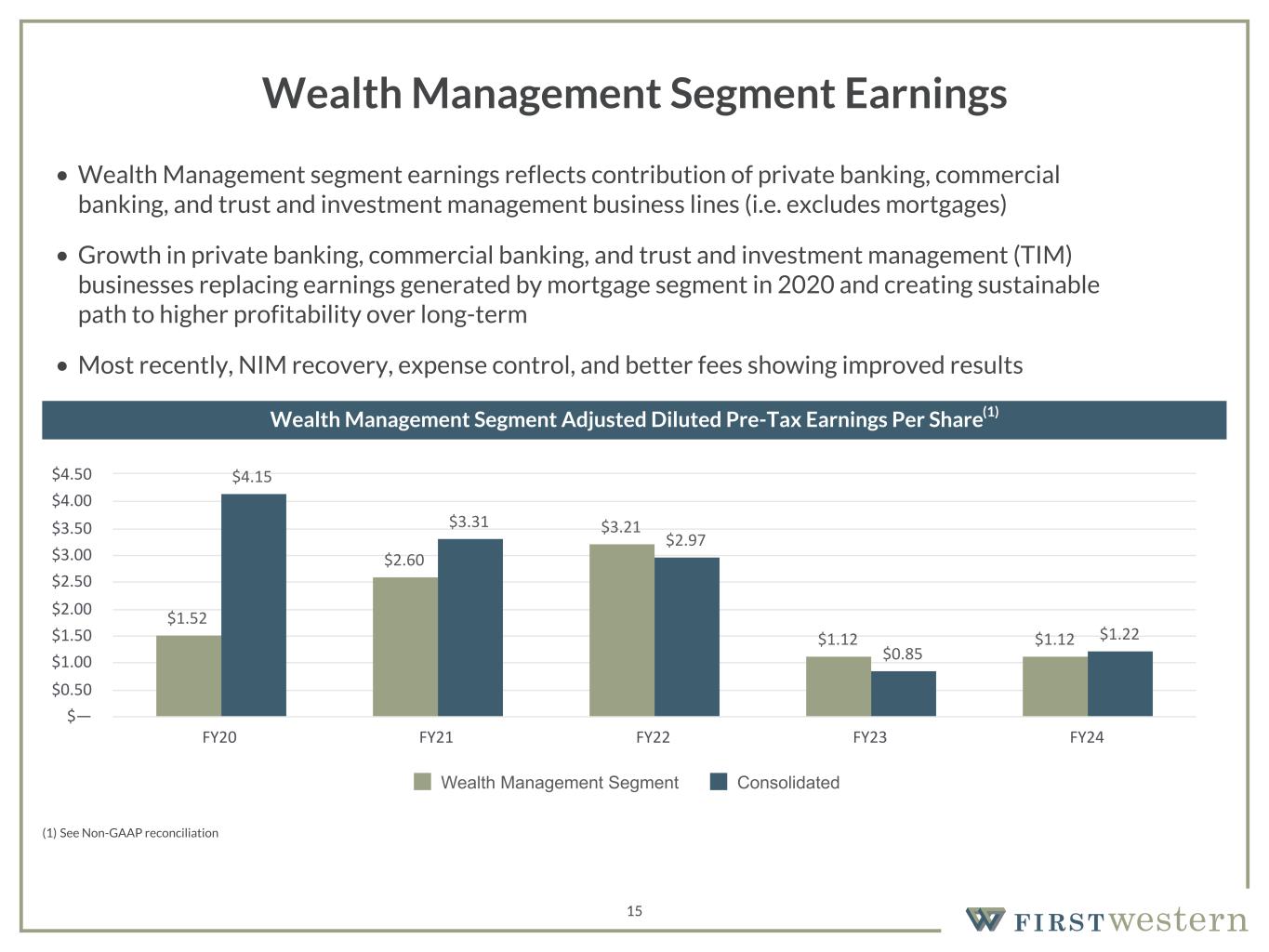 157 180 196 164 166 168 62 94 111 154 161 132 122 125 129 76 78 86 255 255 255 Chart color Table color Special Headlines Slide Headlines / Text on light background Primary Colors Secondary Colors Primary Background / Call Out Boxes / Text on dark background Chart color Table Color Tertiary Colors Chart color Table Color Chart Color Chart Color Approved Fonts AaBbCc 123 Lora (bold) Slide Headlines / Special Headlines AaBbCc 123 Lato (regular, bold, italics) Body Copy / Subheadings / Small Text Descriptions 46 Non-GAAP Reconciliation Consolidated Gross Revenue For the Years Ended, (Dollars in thousands) 2020 2021 2022 2023 2024 Total income before non-interest expense $ 92,615 $ 95,408 $ 107,934 $ 82,698 $ 90,071 Less: Unrealized (loss) gain recognized on equity securities 15 (21) 342 (22) (33) Less: Net loss on loans accounted for under the fair value option — — (891) (2,010) (999) Less: Net gain on equity interests — 489 7 — — Less: Net loss on loans held for sale — — (12) (178) (105) Plus: Provision for credit losses 4,682 1,230 3,682 10,355 1,933 Gross revenue $ 97,282 $ 96,170 $ 112,170 $ 95,263 $ 93,141 Consolidated Adjusted Pre-tax, Preprovision Income For the Years Ended, (Dollars in thousands) 2020 2021 2022 2023 2024 Net income before income tax, as reported $ 33,063 $ 27,280 $ 28,828 $ 7,061 $ 11,579 Plus: Provision for credit losses 4,682 1,230 3,682 10,355 1,933 Pre-tax, Pre-provision Income $ 37,745 $ 28,510 $ 32,510 $ 17,416 $ 13,512 Adjusted Diluted Pre-Tax Earnings Per Share For the Years Ended, (Dollars in thousands) 2020 2021 2022 2023 2024 Wealth Management income before income tax $ 12,086 $ 21,378 $ 31,139 $ 9,660 $ 10,629 Mortgage income (loss) before income tax 20,978 5,902 (2,311) (2,599) 950 Plus: Impairment of contingent consideration assets — — — 1,249 338 Less: Income tax expense 8,529 6,670 7,130 1,836 3,106 Adjusted net income available to common shareholders $ 24,535 $ 20,610 $ 21,698 $ 6,474 $ 8,811 Adjusted diluted weighted average shares 7,961,904 8,235,178 9,713,623 9,725,910 9,755,804 Wealth Management Segment Adjusted Diluted Pre-Tax Earnings Per Share $ 1.52 $ 2.60 $ 3.21 $ 1.12 $ 1.12 Consolidated Adjusted Diluted Pre-Tax Earnings Per Share $ 4.15 $ 3.31 $ 2.97 $ 0.85 $ 1.22
