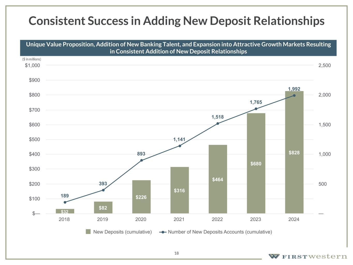 157 180 196 164 166 168 62 94 111 154 161 132 122 125 129 76 78 86 255 255 255 Chart color Table color Special Headlines Slide Headlines / Text on light background Primary Colors Secondary Colors Primary Background / Call Out Boxes / Text on dark background Chart color Table Color Tertiary Colors Chart color Table Color Chart Color Chart Color Approved Fonts AaBbCc 123 Lora (bold) Slide Headlines / Special Headlines AaBbCc 123 Lato(regular, bold, italics) Body Copy / Subheadings / Small Text Descriptions 17 Strong Client Relationships Result in Sticky Deposit Base Stable Deposit Base During Highly Volatile Period for the Banking Industry $2,392 $2,375 $2,420 $2,529 $2,532 $2,411 $2,503 $2,514 $2,515 Total Deposits 1Q23 2Q23 3Q23 4Q23 1Q24 2Q24 3Q24 4Q24 1Q25 $— $500 $1,000 $1,500 $2,000 $2,500 $3,000