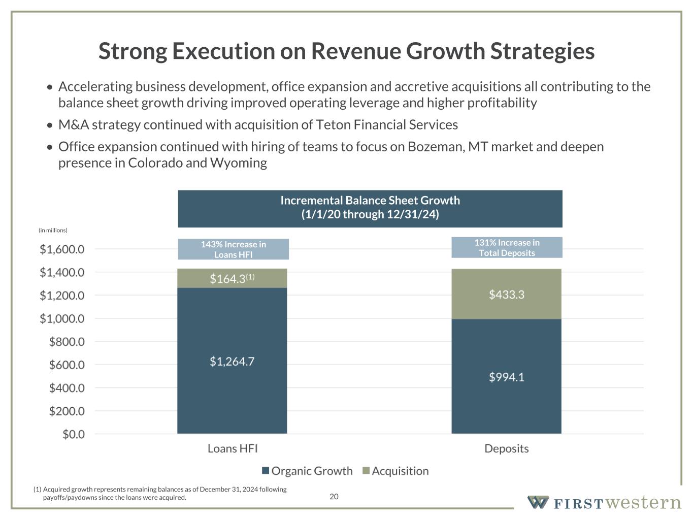 157 180 196 164 166 168 62 94 111 154 161 132 122 125 129 76 78 86 255 255 255 Chart color Table color Special Headlines Slide Headlines / Text on light background Primary Colors Secondary Colors Primary Background / Call Out Boxes / Text on dark background Chart color Table Color Tertiary Colors Chart color Table Color Chart Color Chart Color Approved Fonts AaBbCc 123 Lora (bold) Slide Headlines / Special Headlines AaBbCc 123 Lato(regular, bold, italics) Body Copy / Subheadings / Small Text Descriptions 20 Strong Execution on Revenue Growth Strategies • Accelerating business development, office expansion and accretive acquisitions all contributing to the balance sheet growth driving improved operating leverage and higher profitability • M&A strategy continued with acquisition of Teton Financial Services • Office expansion continued with hiring of teams to focus on Bozeman, MT market and deepen presence in Colorado and Wyoming (in millions) Incremental Balance Sheet Growth (1/1/20 through 12/31/24) 143% Increase in Loans HFI 131% Increase in Total Deposits (1) Acquired growth represents remaining balances as of December 31, 2024 following payoffs/paydowns since the loans were acquired.