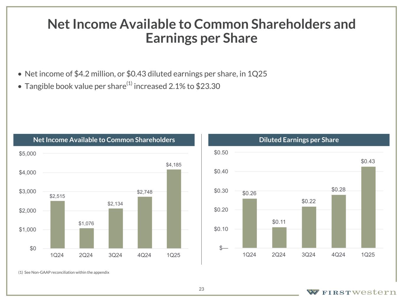 157 180 196 164 166 168 62 94 111 154 161 132 122 125 129 76 78 86 255 255 255 Chart color Table color Special Headlines Slide Headlines / Text on light background Primary Colors Secondary Colors Primary Background / Call Out Boxes / Text on dark background Chart color Table Color Tertiary Colors Chart color Table Color Chart Color Chart Color Approved Fonts AaBbCc 123 Lora (bold) Slide Headlines / Special Headlines AaBbCc 123 Lato(regular, bold, italics) Body Copy / Subheadings / Small Text Descriptions Overview of 1Q25 1Q25 Earnings • Net income available to common shareholders of $4.2 million or $0.43 per diluted share • Net interest income improved to $17.5 million compared to prior quarter of $16.9 million • Positive trends in a number of key areas resulted in improvement in profitability from prior quarter Continued Execution on Strategic Priorities • Continued priority on prudent risk management and conservative approach to new loan production with the contribution of new banking talent helping to drive solid loan production • Successful resolution of two largest OREOs with sale of properties resulting in a net gain • Positive trends in asset quality with declines in non-performing assets • Continued success in deposit gathering efforts with increase in noninterest-bearing deposits during 1Q25 Positive Trends in Key Metrics • Further increase in tangible book value per share • Improvement in NIM from prior quarter and expectation of continued improvement due primarily to improved cost of funds • Growth in mortgage banking revenue resulting from higher volumes due to lower interest rates and contribution of new MLOs 22