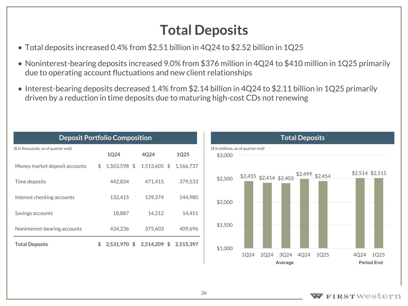 157 180 196 164 166 168 62 94 111 154 161 132 122 125 129 76 78 86 255 255 255 Chart color Table color Special Headlines Slide Headlines / Text on light background Primary Colors Secondary Colors Primary Background / Call Out Boxes / Text on dark background Chart color Table Color Tertiary Colors Chart color Table Color Chart Color Chart Color Approved Fonts AaBbCc 123 Lora (bold) Slide Headlines / Special Headlines AaBbCc 123 Lato(regular, bold, italics) Body Copy / Subheadings / Small Text Descriptions 24 Loan Portfolio • Total loans held for investment were flat from prior quarter due to offsetting production and loan payoffs • Total average loans held for investment increased $21.4 million in the quarter • New loan production in 1Q25 of $70.8 million with focus primarily on relationship-based lending • Average rate on new loan production of 6.89% was higher than average rate of loans paying off and accretive to NIM 1Q24 4Q24 1Q25 Cash, Securities and Other $ 151,178 $ 120,005 $ 101,078 Consumer and Other 18,556 17,333 16,688 Construction and Development 333,284 315,686 291,133 1-4 Family Residential 910,129 960,354 971,179 Non-Owner Occupied CRE 562,862 614,384 636,820 Owner Occupied CRE 194,338 173,223 182,417 Commercial and Industrial 297,573 220,501 223,197 Total $ 2,467,920 $ 2,421,486 $ 2,422,512 Loans accounted for at fair value(2) 12,276 7,508 6,280 Total Loans HFI $ 2,480,196 $ 2,428,994 $ 2,428,792 Mortgage loans held for sale 10,470 25,455 10,557 Loans held for sale — 251 — Total Loans $ 2,490,666 $ 2,454,700 $ 2,439,349 (1) Represents unpaid principal balance. Excludes deferred (fees) costs, and amortized premium/ (unaccreted discount). (2) Excludes fair value adjustments on loans accounted for under the fair value option. ($ in thousands, as of quarter end) Loan Portfolio Composition(1) Loan Portfolio Details Loan Production & Loan Payoffs Total Loans(1) $2,510 $2,476 $2,458 $2,421 $2,428 $2,455 $2,439 1Q24 2Q24 3Q24 4Q24 1Q25 4Q24 1Q25 $1,000 $1,500 $2,000 $2,500 $3,000 Average Period End $30.6 $49.5 $82.8 $93.5 $70.8 $100.0 $100.3 $153.8 $97.1 $71.6 Production Loan Payoffs 1Q24 2Q24 3Q24 4Q24 1Q25 $— $50 $100 $150 $200 ($ in millions) ($ in millions, as of quarter end)