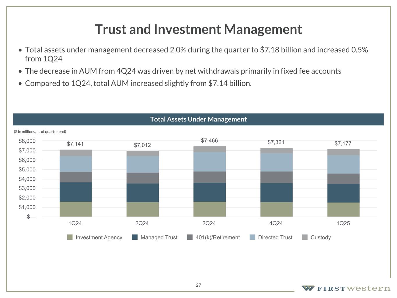 157 180 196 164 166 168 62 94 111 154 161 132 122 125 129 76 78 86 255 255 255 Chart color Table color Special Headlines Slide Headlines / Text on light background Primary Colors Secondary Colors Primary Background / Call Out Boxes / Text on dark background Chart color Table Color Tertiary Colors Chart color Table Color Chart Color Chart Color Approved Fonts AaBbCc 123 Lora (bold) Slide Headlines / Special Headlines AaBbCc 123 Lato(regular, bold, italics) Body Copy / Subheadings / Small Text Descriptions 26 Total Deposits • Total deposits increased 0.4% from $2.51 billion in 4Q24 to $2.52 billion in 1Q25 • Noninterest-bearing deposits increased 9.0% from $376 million in 4Q24 to $410 million in 1Q25 primarily due to operating account fluctuations and new client relationships • Interest-bearing deposits decreased 1.4% from $2.14 billion in 4Q24 to $2.11 billion in 1Q25 primarily driven by a reduction in time deposits due to maturing high-cost CDs not renewing 1Q24 4Q24 1Q25 Money market deposit accounts $ 1,503,598 $ 1,513,605 $ 1,566,737 Time deposits 442,834 471,415 379,533 Interest checking accounts 132,415 139,374 144,980 Savings accounts 18,887 14,212 14,451 Noninterest-bearing accounts 434,236 375,603 409,696 Total Deposits $ 2,531,970 $ 2,514,209 $ 2,515,397 Deposit Portfolio Composition Total Deposits $2,455 $2,414 $2,403 $2,499 $2,454 $2,514 $2,515 1Q24 2Q24 3Q24 4Q24 1Q25 4Q24 1Q25 $1,000 $1,500 $2,000 $2,500 $3,000 Average Period End ($ in millions, as of quarter end)($ in thousands, as of quarter end)