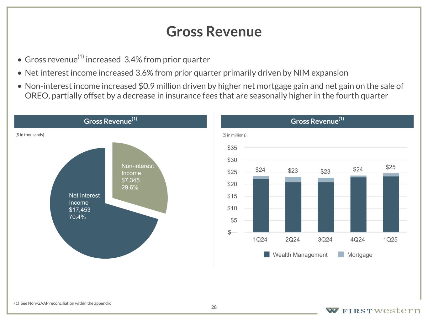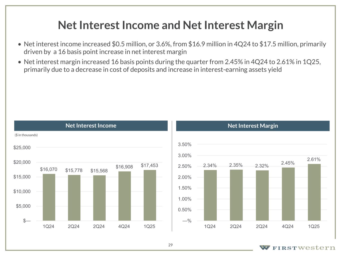 157 180 196 164 166 168 62 94 111 154 161 132 122 125 129 76 78 86 255 255 255 Chart color Table color Special Headlines Slide Headlines / Text on light background Primary Colors Secondary Colors Primary Background / Call Out Boxes / Text on dark background Chart color Table Color Tertiary Colors Chart color Table Color Chart Color Chart Color Approved Fonts AaBbCc 123 Lora (bold) Slide Headlines / Special Headlines AaBbCc 123 Lato (regular, bold, italics) Body Copy / Subheadings / Small Text Descriptions (1) See Non-GAAP reconciliation within the appendix Gross Revenue Gross Revenue(1) Gross Revenue(1) $24 $23 $23 $24 $25 Wealth Management Mortgage 1Q24 2Q24 3Q24 4Q24 1Q25 $— $5 $10 $15 $20 $25 $30 $35 • Gross revenue(1) increased 3.4% from prior quarter • Net interest income increased 3.6% from prior quarter primarily driven by NIM expansion • Non-interest income increased $0.9 million driven by higher net mortgage gain and net gain on the sale of OREO, partially offset by a decrease in insurance fees that are seasonally higher in the fourth quarter Non-interest Income $7,345 29.6% Net Interest Income $17,453 70.4% ($ in thousands) ($ in millions) 28
