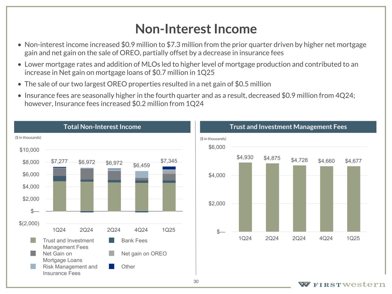 157 180 196 164 166 168 62 94 111 154 161 132 122 125 129 76 78 86 255 255 255 Chart color Table color Special Headlines Slide Headlines / Text on light background Primary Colors Secondary Colors Primary Background / Call Out Boxes / Text on dark background Chart color Table Color Tertiary Colors Chart color Table Color Chart Color Chart Color Approved Fonts AaBbCc 123 Lora (bold) Slide Headlines / Special Headlines AaBbCc 123 Lato (regular, bold, italics) Body Copy / Subheadings / Small Text Descriptions 29 Net Interest Income and Net Interest Margin • Net interest income increased $0.5 million, or 3.6%, from $16.9 million in 4Q24 to $17.5 million, primarily driven by a 16 basis point increase in net interest margin • Net interest margin increased 16 basis points during the quarter from 2.45% in 4Q24 to 2.61% in 1Q25, primarily due to a decrease in cost of deposits and increase in interest-earning assets yield Net Interest Income Net Interest Margin $16,070 $15,778 $15,568 $16,908 $17,453 1Q24 2Q24 2Q24 4Q24 1Q25 $— $5,000 $10,000 $15,000 $20,000 $25,000 2.34% 2.35% 2.32% 2.45% 2.61% 1Q24 2Q24 2Q24 4Q24 1Q25 —% 0.50% 1.00% 1.50% 2.00% 2.50% 3.00% 3.50% ($ in thousands)