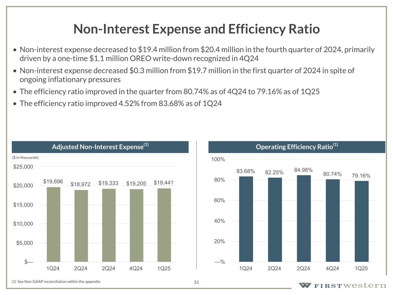 157 180 196 164 166 168 62 94 111 154 161 132 122 125 129 76 78 86 255 255 255 Chart color Table color Special Headlines Slide Headlines / Text on light background Primary Colors Secondary Colors Primary Background / Call Out Boxes / Text on dark background Chart color Table Color Tertiary Colors Chart color Table Color Chart Color Chart Color Approved Fonts AaBbCc 123 Lora (bold) Slide Headlines / Special Headlines AaBbCc 123 Lato (regular, bold, italics) Body Copy / Subheadings / Small Text Descriptions 30 Non-Interest Income • Non-interest income increased $0.9 million to $7.3 million from the prior quarter driven by higher net mortgage gain and net gain on the sale of OREO, partially offset by a decrease in insurance fees • Lower mortgage rates and addition of MLOs led to higher level of mortgage production and contributed to an increase in Net gain on mortgage loans of $0.7 million in 1Q25 • The sale of our two largest OREO properties resulted in a net gain of $0.5 million • Insurance fees are seasonally higher in the fourth quarter and as a result, decreased $0.9 million from 4Q24; however, Insurance fees increased $0.2 million from 1Q24 Total Non-Interest Income Trust and Investment Management Fees $7,277 $6,972 $6,972 $6,459 $7,345 Trust and Investment Management Fees Bank Fees Net Gain on Mortgage Loans Net gain on OREO Risk Management and Insurance Fees Other 1Q24 2Q24 2Q24 4Q24 1Q25 $(2,000) $— $2,000 $4,000 $6,000 $8,000 $10,000 $4,930 $4,875 $4,728 $4,660 $4,677 1Q24 2Q24 2Q24 4Q24 1Q25 $— $2,000 $4,000 $6,000 ($ in thousands) ($ in thousands)
