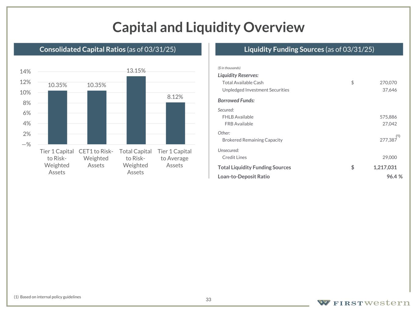 157 180 196 164 166 168 62 94 111 154 161 132 122 125 129 76 78 86 255 255 255 Chart color Table color Special Headlines Slide Headlines / Text on light background Primary Colors Secondary Colors Primary Background / Call Out Boxes / Text on dark background Chart color Table Color Tertiary Colors Chart color Table Color Chart Color Chart Color Approved Fonts AaBbCc 123 Lora (bold) Slide Headlines / Special Headlines AaBbCc 123 Lato (regular, bold, italics) Body Copy / Subheadings / Small Text Descriptions 32 Asset Quality • NPAs decreased $31.8 million to $17.1 million due to the sale of two OREO properties • NPLs decreased $0.3 million to $12.8 million due to the charge-off of a non-performing loan that had previously been held for sale • NPA/Total Assets decreased from 1.68% as of 4Q24 to 0.59% as of 1Q25 • ACL/Total Loans decreased from 0.76% in 4Q24 to 0.74% in 1Q25, primarily driven by decreased provision on pooled loans due to mix shifts within the loan portfolio Non-Performing Assets/Total Assets Net Charge-Offs (Recoveries)/Average Loans 1.57% 1.68% 1.79% 1.68% 0.59% 1Q24 2Q24 2Q24 4Q24 1Q25 —% 0.2% 0.4% 0.6% 0.8% 1.0% 1.2% 1.4% 1.6% 1.8% 2.0% 2.2% —% —% 0.38% (0.01)% 0.02% 1Q24 2Q24 2Q24 4Q24 1Q25 (0.1)% —% 0.1% 0.2% 0.3% 0.4%