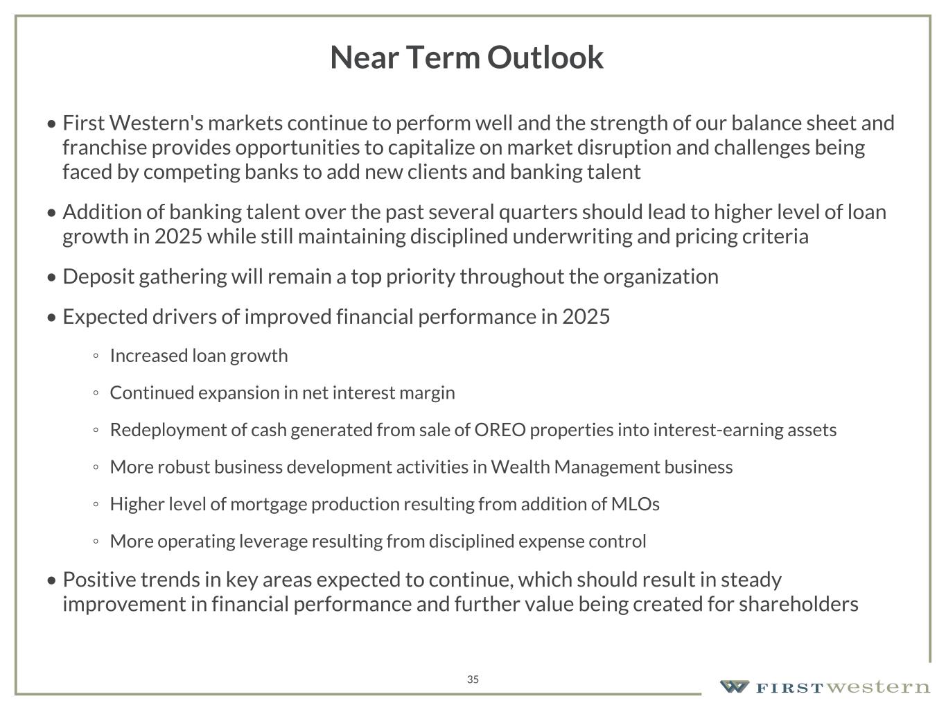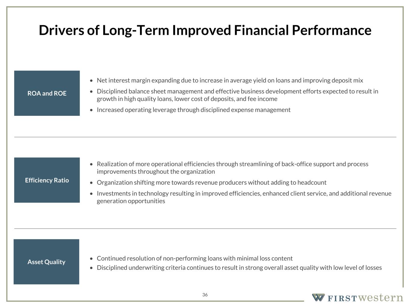 157 180 196 164 166 168 62 94 111 154 161 132 122 125 129 76 78 86 255 255 255 Chart color Table color Special Headlines Slide Headlines / Text on light background Primary Colors Secondary Colors Primary Background / Call Out Boxes / Text on dark background Chart color Table Color Tertiary Colors Chart color Table Color Chart Color Chart Color Approved Fonts AaBbCc 123 Lora (bold) Slide Headlines / Special Headlines AaBbCc 123 Lato (regular, bold, italics) Body Copy / Subheadings / Small Text Descriptions 35 Near Term Outlook • First Western's markets continue to perform well and the strength of our balance sheet and franchise provides opportunities to capitalize on market disruption and challenges being faced by competing banks to add new clients and banking talent • Addition of banking talent over the past several quarters should lead to higher level of loan growth in 2025 while still maintaining disciplined underwriting and pricing criteria • Deposit gathering will remain a top priority throughout the organization • Expected drivers of improved financial performance in 2025 ◦ Increased loan growth ◦ Continued expansion in net interest margin ◦ Redeployment of cash generated from sale of OREO properties into interest-earning assets ◦ More robust business development activities in Wealth Management business ◦ Higher level of mortgage production resulting from addition of MLOs ◦ More operating leverage resulting from disciplined expense control • Positive trends in key areas expected to continue, which should result in steady improvement in financial performance and further value being created for shareholders