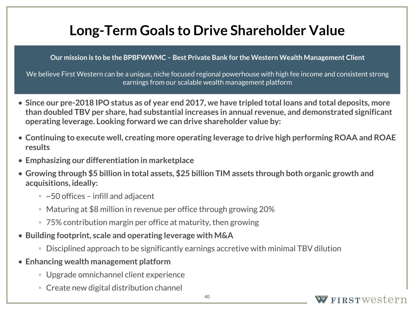 157 180 196 164 166 168 62 94 111 154 161 132 122 125 129 76 78 86 255 255 255 Chart color Table color Special Headlines Slide Headlines / Text on light background Primary Colors Secondary Colors Primary Background / Call Out Boxes / Text on dark background Chart color Table Color Tertiary Colors Chart color Table Color Chart Color Chart Color Approved Fonts AaBbCc 123 Lora (bold) Slide Headlines / Special Headlines AaBbCc 123 Lato (regular, bold, italics) Body Copy / Subheadings / Small Text Descriptions 40 Long-Term Goals to Drive Shareholder Value • Since our pre-2018 IPO status as of year end 2017, we have tripled total loans and total deposits, more than doubled TBV per share, had substantial increases in annual revenue, and demonstrated significant operating leverage. Looking forward we can drive shareholder value by: • Continuing to execute well, creating more operating leverage to drive high performing ROAA and ROAE results • Emphasizing our differentiation in marketplace • Growing through $5 billion in total assets, $25 billion TIM assets through both organic growth and acquisitions, ideally: ◦ ~50 offices – infill and adjacent ◦ Maturing at $8 million in revenue per office through growing 20% ◦ 75% contribution margin per office at maturity, then growing • Building footprint, scale and operating leverage with M&A ◦ Disciplined approach to be significantly earnings accretive with minimal TBV dilution • Enhancing wealth management platform ◦ Upgrade omnichannel client experience ◦ Create new digital distribution channel Our mission is to be the BPBFWWMC – Best Private Bank for the Western Wealth Management Client We believe First Western can be a unique, niche focused regional powerhouse with high fee income and consistent strong earnings from our scalable wealth management platform