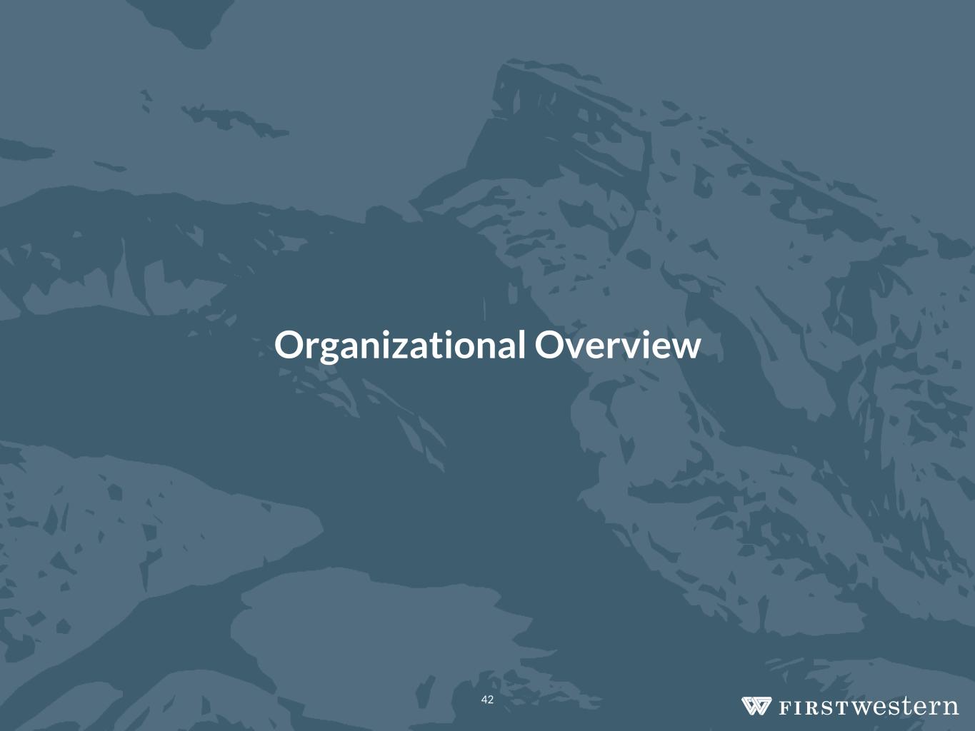 157 180 196 164 166 168 62 94 111 154 161 132 122 125 129 76 78 86 255 255 255 Chart color Table color Special Headlines Slide Headlines / Text on light background Primary Colors Secondary Colors Primary Background / Call Out Boxes / Text on dark background Chart color Table Color Tertiary Colors Chart color Table Color Chart Color Chart Color Approved Fonts AaBbCc 123 Lora (bold) Slide Headlines / Special Headlines AaBbCc 123 Lato (regular, bold, italics) Body Copy / Subheadings / Small Text Descriptions 39 Organizational Structure Built for Scale Full Bank and Trust: ◦ Aspen, CO ◦ Boulder, CO ◦ Cherry Creek, CO ◦ Denver, CO ◦ DTC/Cherry Hills, CO ◦ Northern Colorado ◦ Jackson Hole, WY ◦ Rock Springs, WY ◦ Pinedale, WY ◦ Scottsdale, AZ ◦ Broomfield, CO ◦ Phoenix, AZ ◦ Vail Valley, Avon, CO ◦ Bozeman, MT Loan Production Offices: ◦ Ft. Collins, CO ◦ Greenwood Village, CO ◦ Loveland, CO ◦ Cheyenne, WY Trust Offices: ◦ Century City, CA ◦ Investment Management ◦ Fiduciary/ Trust ◦ Wealth Planning ◦ Retirement Services ◦ Insurance ◦ Mortgage Services ◦ Treasury Management First Western Profit Centers Product Groups Support Centers ◦ Finance & Accounting ◦ Risk & Compliance ◦ Enterprise Technology ◦ Human Capital ◦ Credit Analysis ◦ Bank & Trust/Investment Operations ◦ Marketing/Branding Big operating leverage from expert, high fixed cost teams Very profitable when mature