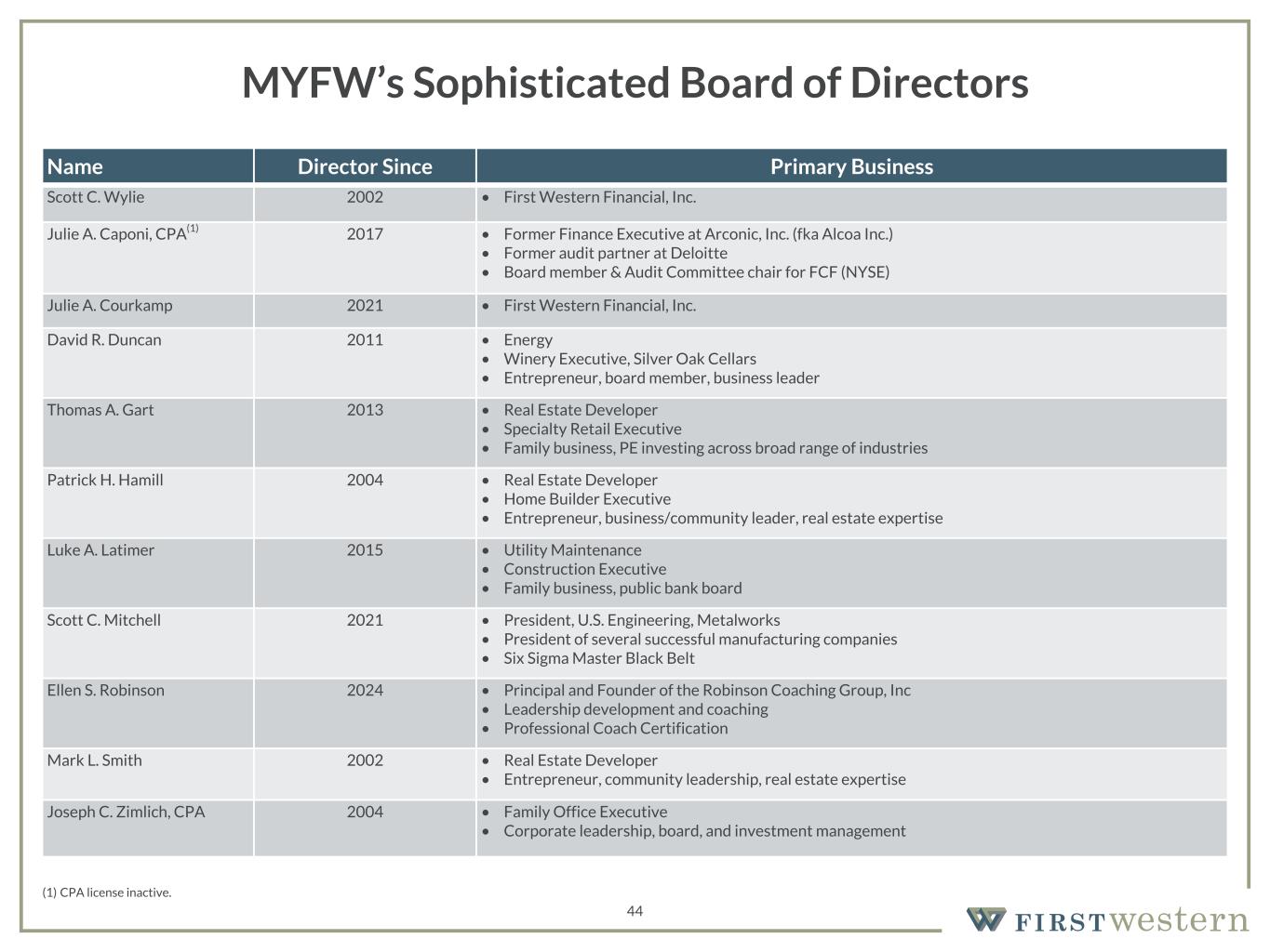 157 180 196 164 166 168 62 94 111 154 161 132 122 125 129 76 78 86 255 255 255 Chart color Table color Special Headlines Slide Headlines / Text on light background Primary Colors Secondary Colors Primary Background / Call Out Boxes / Text on dark background Chart color Table Color Tertiary Colors Chart color Table Color Chart Color Chart Color Approved Fonts AaBbCc 123 Lora (bold) Slide Headlines / Special Headlines AaBbCc 123 Lato (regular, bold, italics) Body Copy / Subheadings / Small Text Descriptions Name Director Since Primary Business Scott C. Wylie 2002 • First Western Financial, Inc. Julie A. Caponi, CPA(1) 2017 • Former Finance Executive at Arconic, Inc. (fka Alcoa Inc.) • Former audit partner at Deloitte • Board member & Audit Committee chair for FCF (NYSE) Julie A. Courkamp 2021 • First Western Financial, Inc. David R. Duncan 2011 • Energy • Winery Executive, Silver Oak Cellars • Entrepreneur, board member, business leader Thomas A. Gart 2013 • Real Estate Developer • Specialty Retail Executive • Family business, PE investing across broad range of industries Patrick H. Hamill 2004 • Real Estate Developer • Home Builder Executive • Entrepreneur, business/community leader, real estate expertise Luke A. Latimer 2015 • Utility Maintenance • Construction Executive • Family business, public bank board Scott C. Mitchell 2021 • President, U.S. Engineering, Metalworks • President of several successful manufacturing companies • Six Sigma Master Black Belt Ellen S. Robinson 2024 • Principal and Founder of the Robinson Coaching Group, Inc • Leadership development and coaching • Professional Coach Certification Mark L. Smith 2002 • Real Estate Developer • Entrepreneur, community leadership, real estate expertise Joseph C. Zimlich, CPA 2004 • Family Office Executive • Corporate leadership, board, and investment management 44 MYFW’s Sophisticated Board of Directors (1) CPA license inactive.